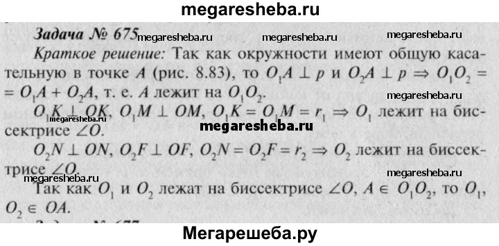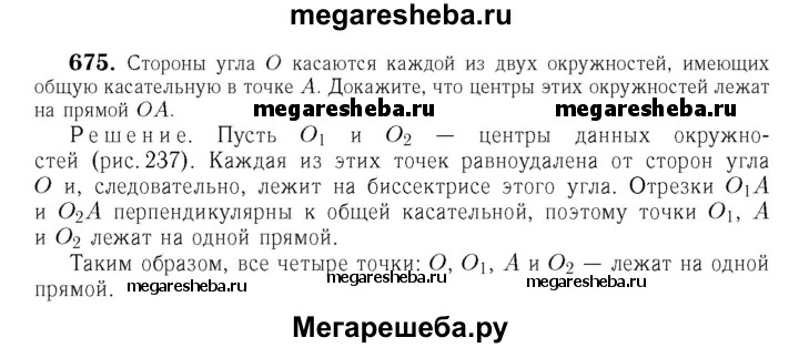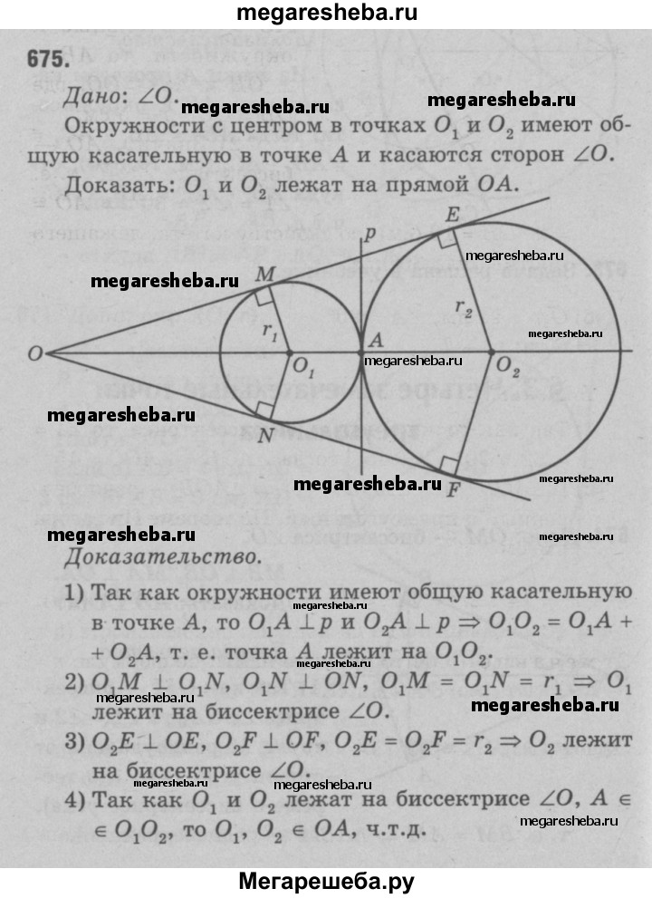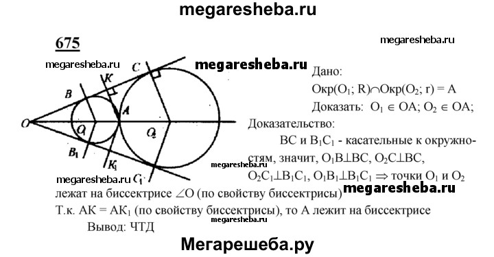 675 Стороны угла О касаются каждой из двух окружностей, имеющих общую касательную в точке А. Докажите, что центры этих окружностей лежат на прямой OA.