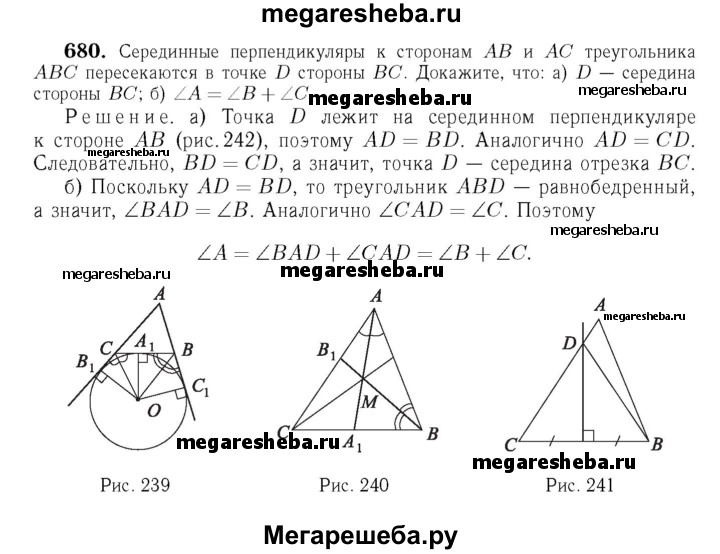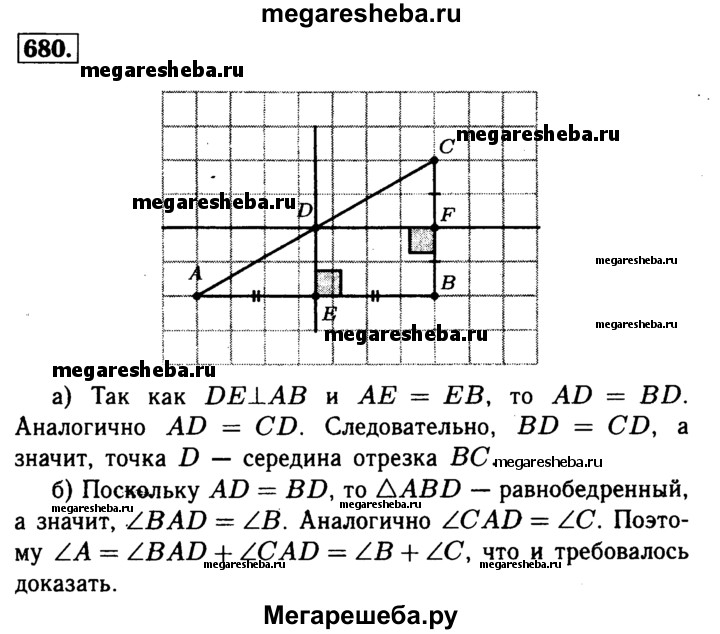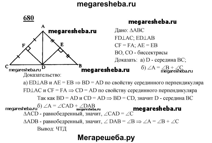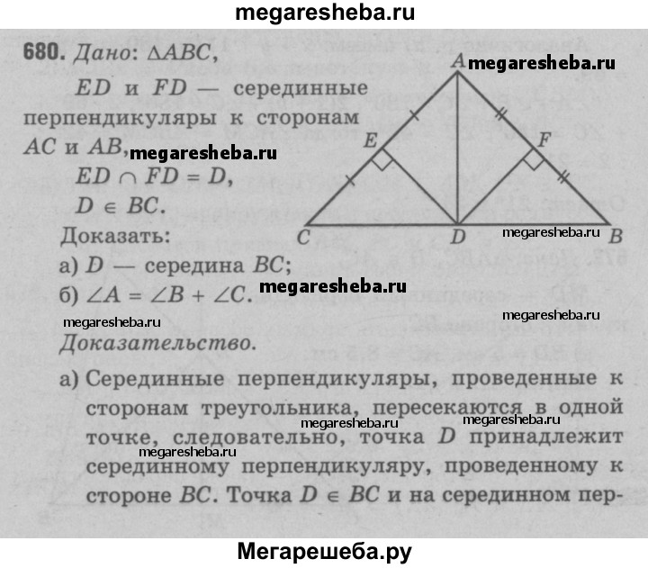 680 Серединные перпендикуляры к сторонам АВ и АС треугольника ABC пересекаются в точке D стороны ВС. Докажите, что: а) точка D — середина стороны ВС; б) ∠A = ∠B + ∠C.