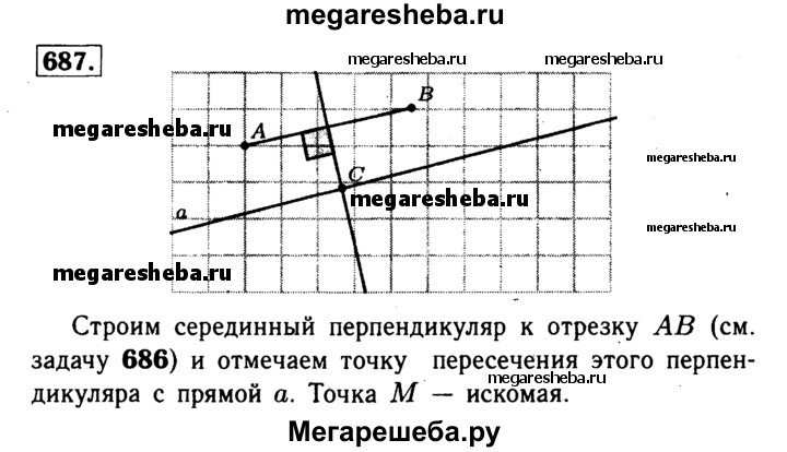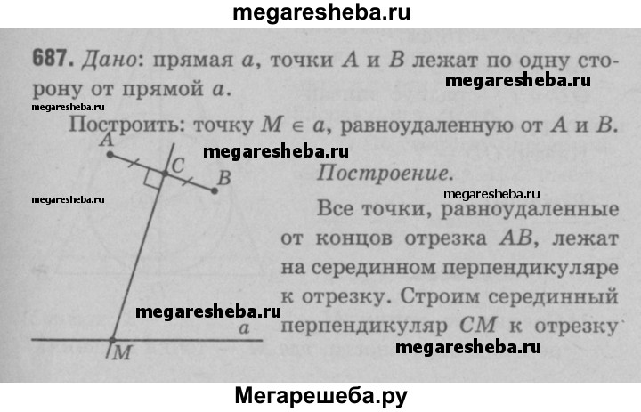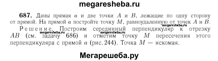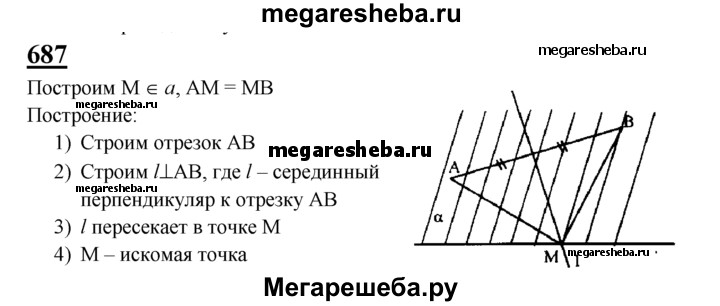 687 Даны прямая а и две точки А я В, лежащие по одну сторону от этой прямой. На прямой а постройте точку М, равноудалённую от точек А и В.