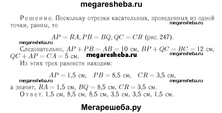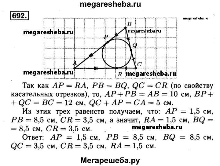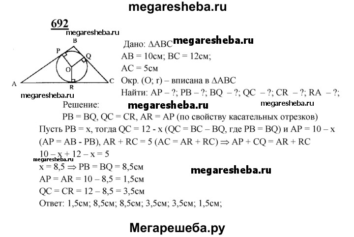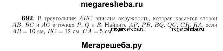 692 В треугольник ABC вписана окружность, которая касается сторон АВ, ВС и СА в точках Р, Q и R. Найдите АР, РВ, BQ, QC, CR, RA, если АВ = 10 см, ВС = 12 см, С А = 5 см.