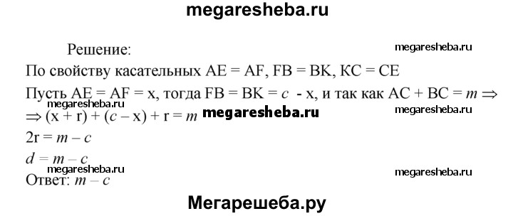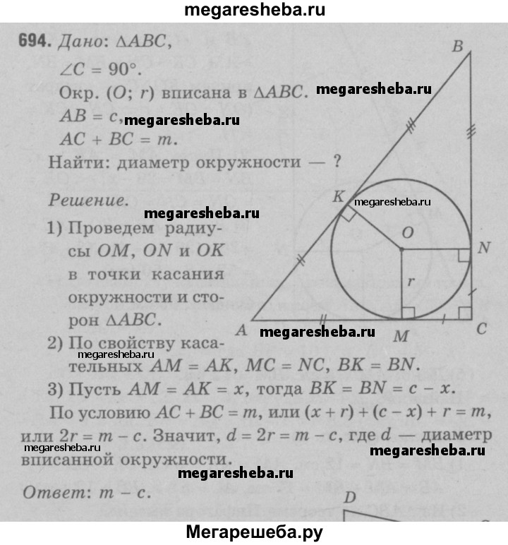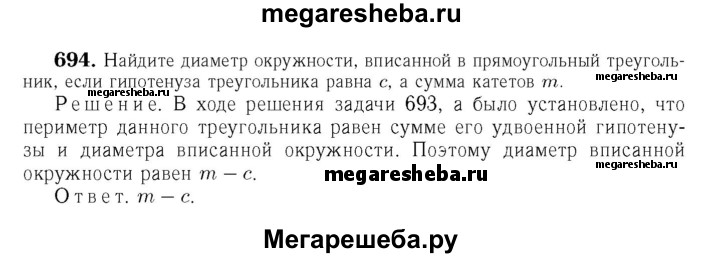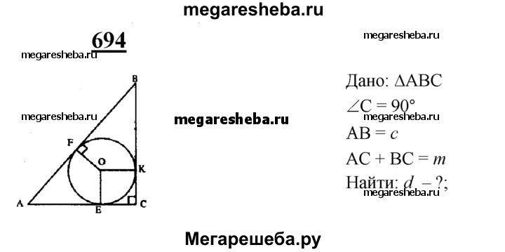 694 Найдите диаметр окружности, вписанной в прямоугольный треугольник, если гипотенуза треугольника равна с, а сумма катетов равна m.