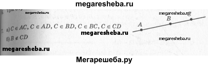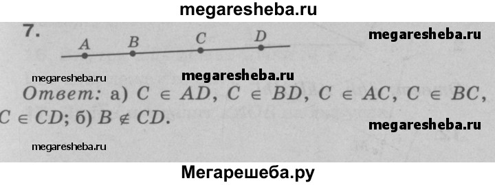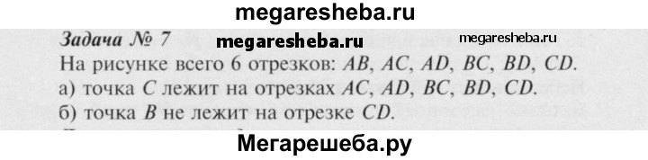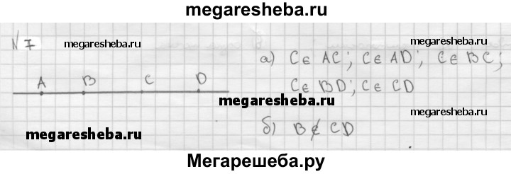 7 На рисунке 10 изображена прямая, на ней отмечены точки А, В, С и D. Назовите все отрезки: а) на которых лежит точка С; б) на которых не лежит точка В