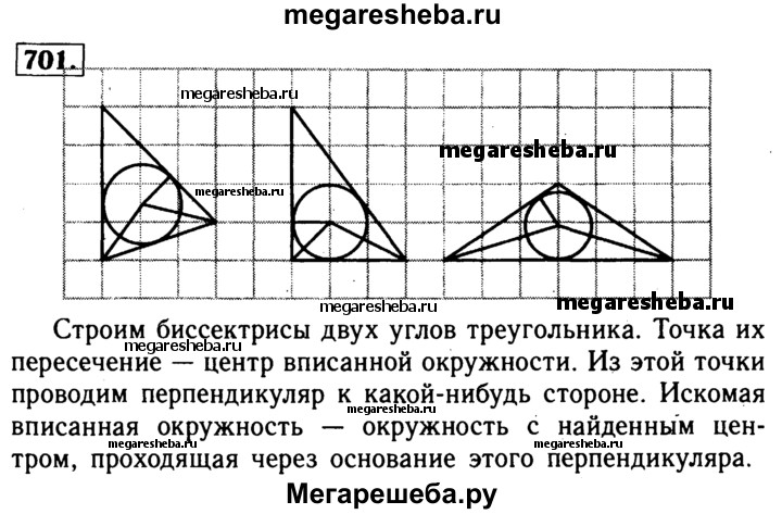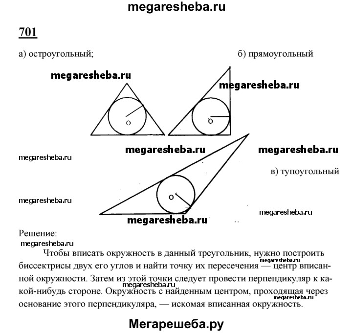 701 Начертите три треугольника: остроугольный, прямоугольный и тупоугольный. В каждый из них впишите окружность.