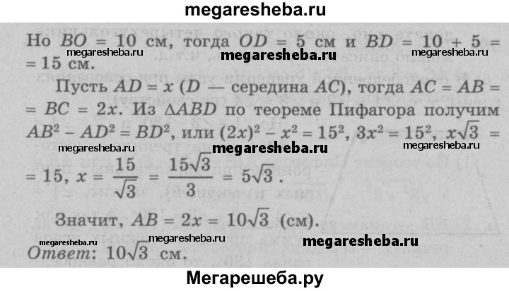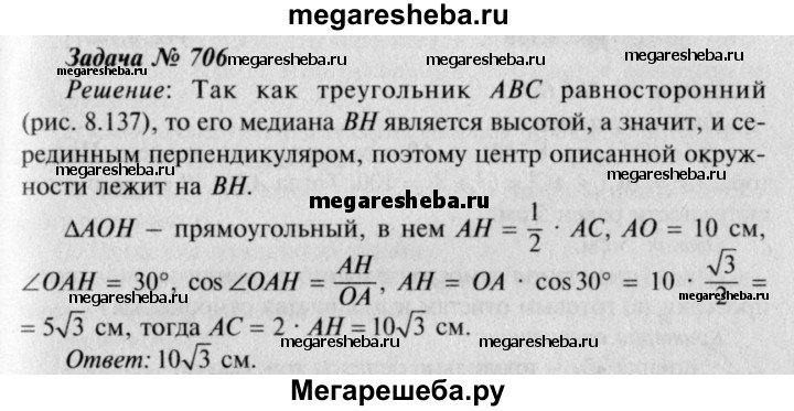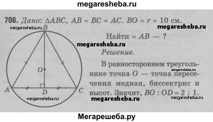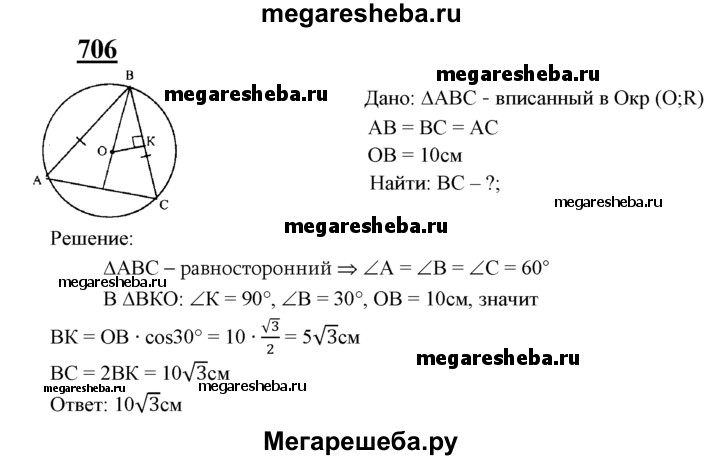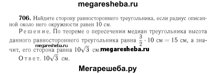 706 Найдите сторону равностороннего треугольника, если радиус описанной около него окружности равен 10 см.