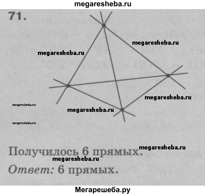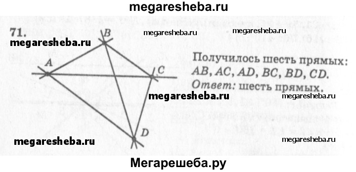 71 Отметьте четыре точки так, чтобы никакие три не лежали на одной прямой. Через каждую пару точек проведите прямую. Сколько получилось прямых?