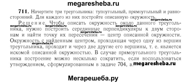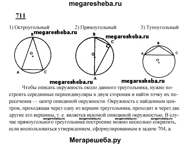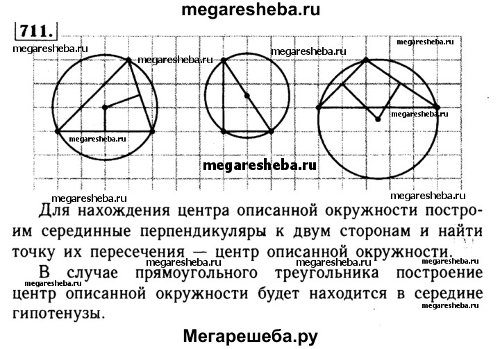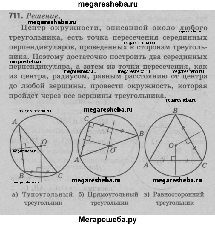 711 Начертите три треугольника: тупоугольный, прямоугольный и равносторонний. Для каждого из них постройте описанную окружность.