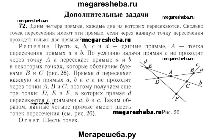 72 Даны четыре прямые, каждые две из которых пересекаются. Сколько точек пересечения имеют эти прямые, если через каждую точку пересечения проходят только две прямые?
