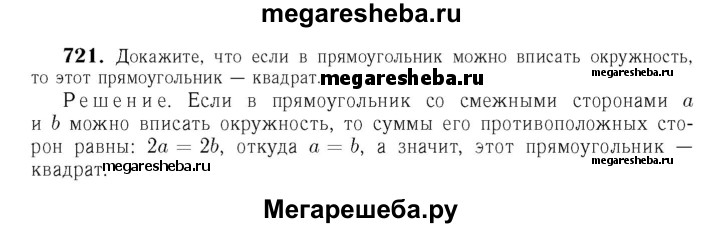 721 Докажите, что если в прямоугольник можно вписать окружность, то этот прямоугольник — квадрат.