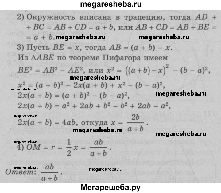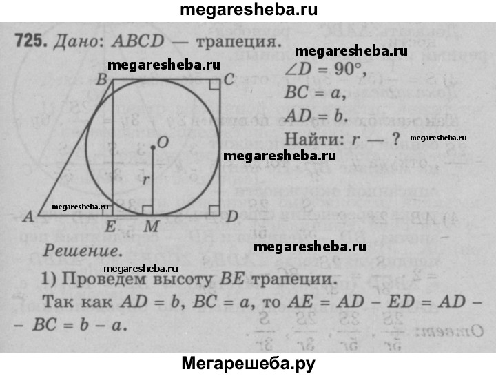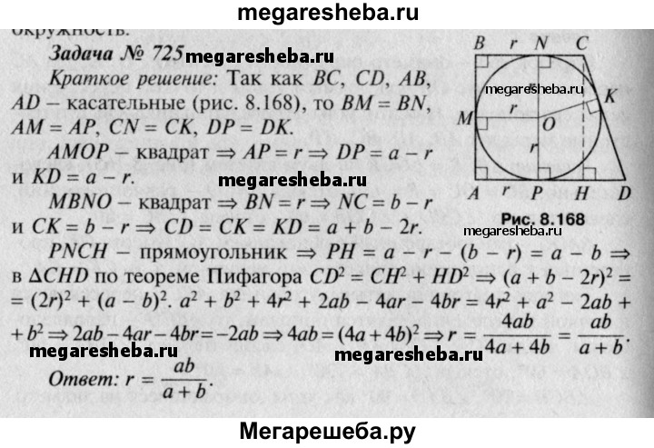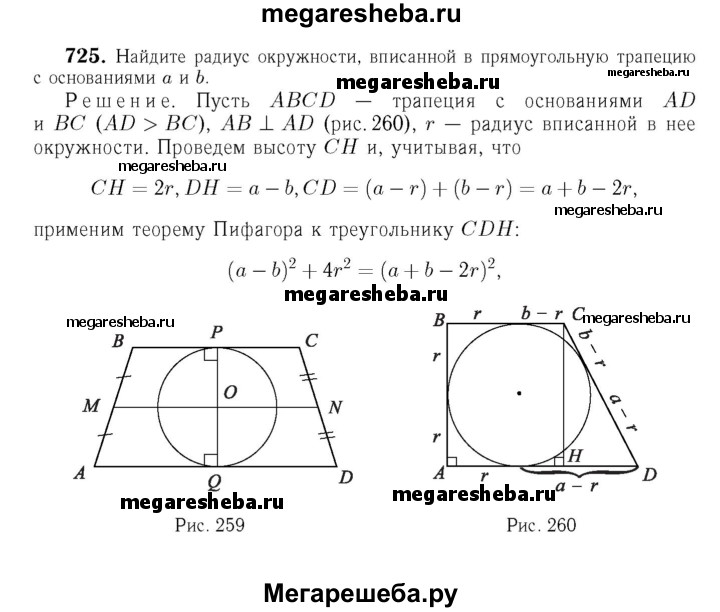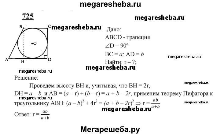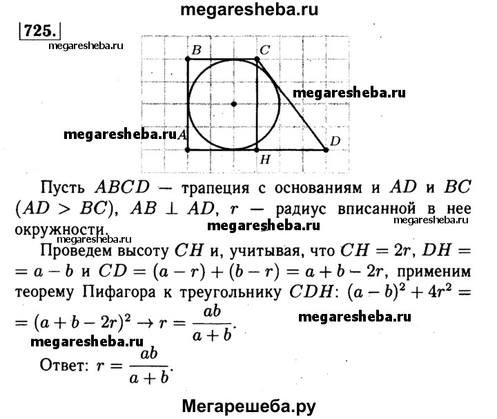 725 Найдите радиус окружности, вписанной в прямоугольную трапецию с основаниями а и b.