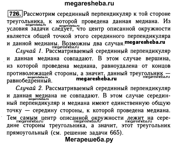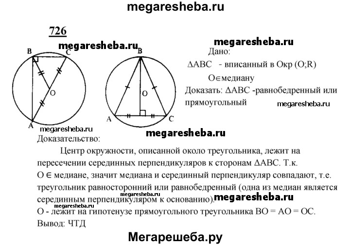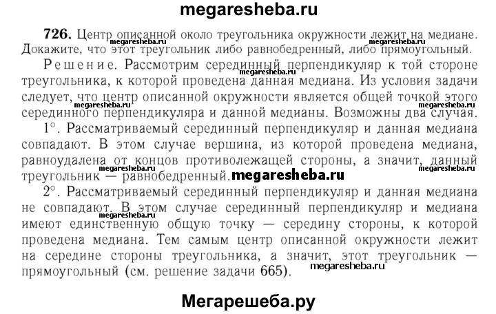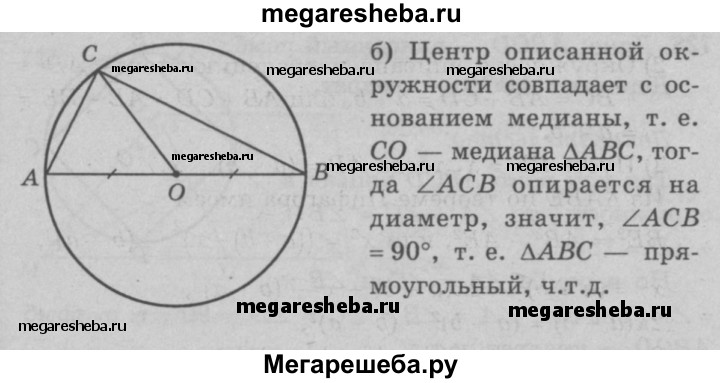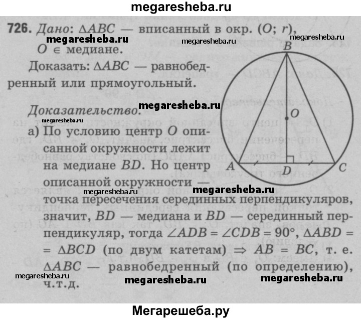 726 Центр описанной около треугольника окружности лежит на медиане. Докажите, что этот треугольник либо равнобедренный, либо прямоугольный.