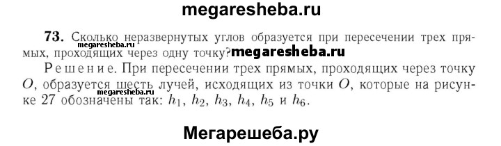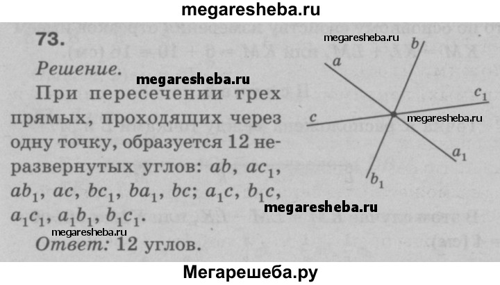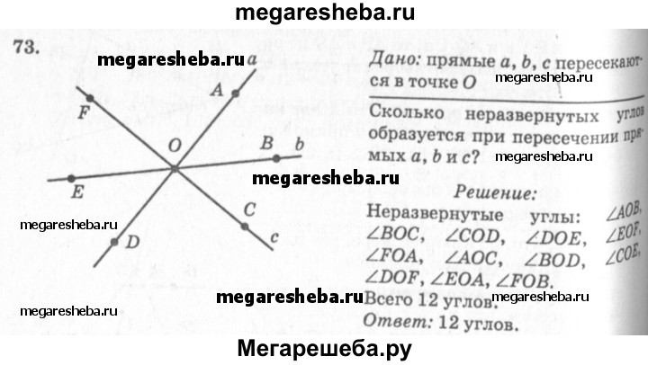 73 Сколько неразвёрнутых углов образуется при пересечении трёх прямых, проходящих через одну точку?