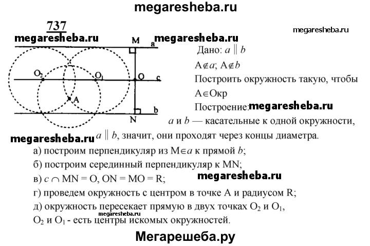 737 Даны две параллельные прямые и точка, не лежащая ни на одной из них. Постройте окружность, проходящую через данную точку и касающуюся данных прямых.