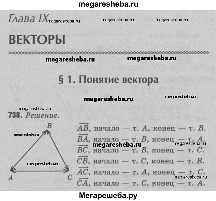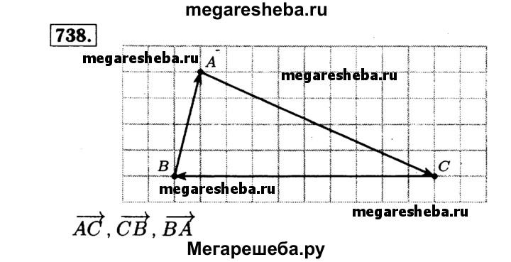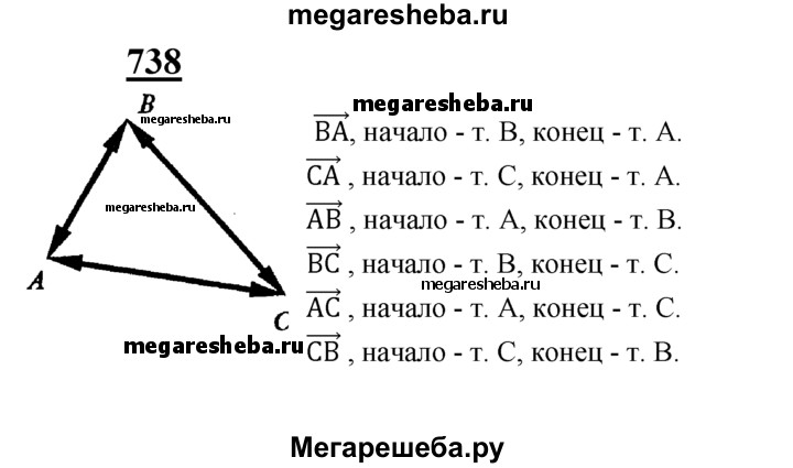 738 Отметьте точки А, В и С, не лежащие на одной прямой. Начертите все ненулевые векторы, начало и конец которых совпадают с какими-то двумя из этих точек. Выпишите все полученные векторы и укажите начало и конец каждого вектора.