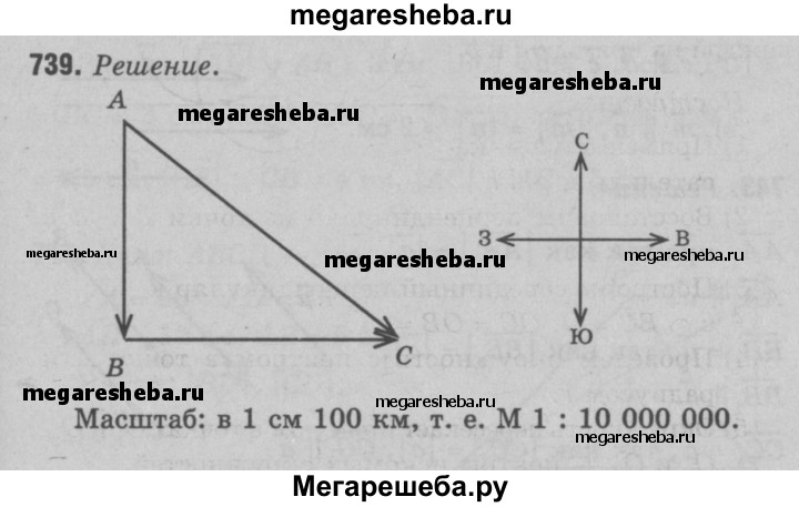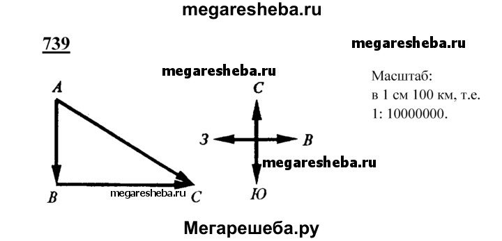739 Выбрав подходящий масштаб, начертите векторы, изображающие полёт самолёта сначала на 300 км на юг от города А до В, а потом на 500 км на восток от города В до С. Затем начертите вектор АС, который изображает перемещение из начальной точки в конечную.