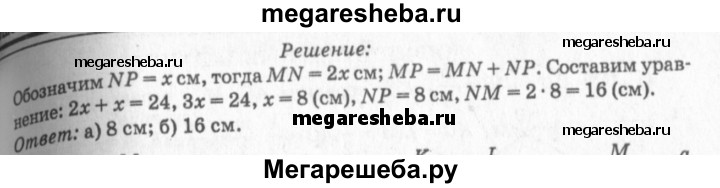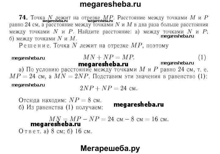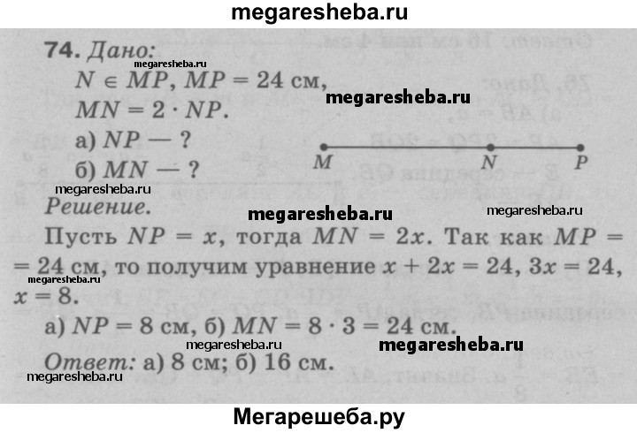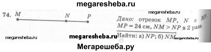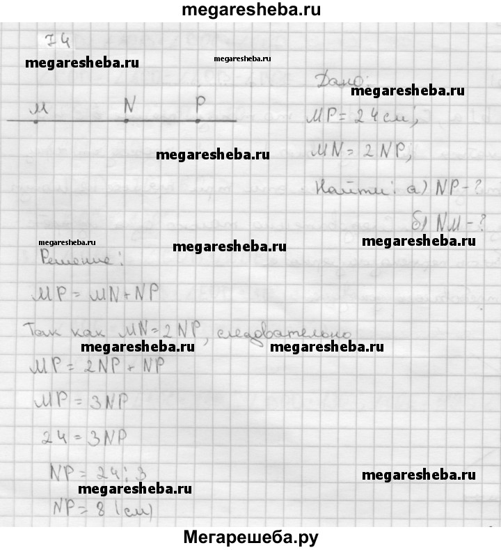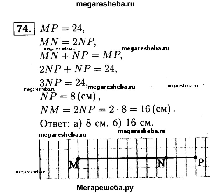 74 Точка N лежит на отрезке MP. Расстояние между точками М и Р равно 24 см, а расстояние между точками N и М в два раза больше расстояния между точками N и Р. Найдите расстояние: а) между точками N и Р; б) между точками N и М.