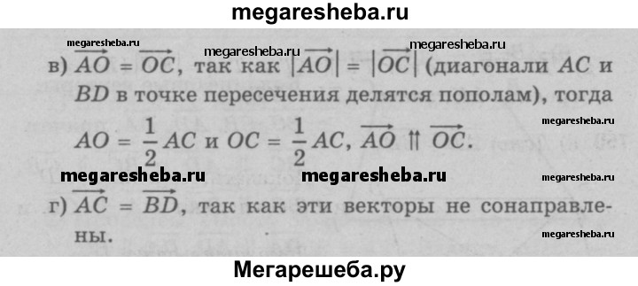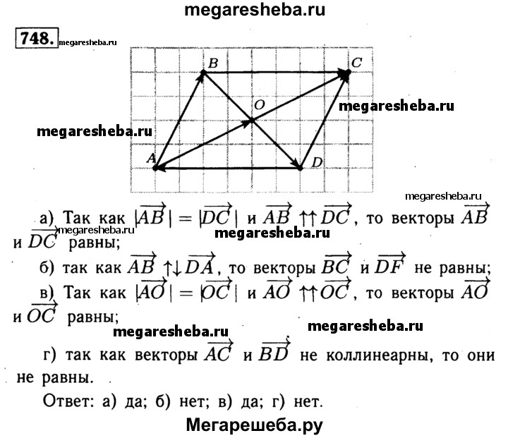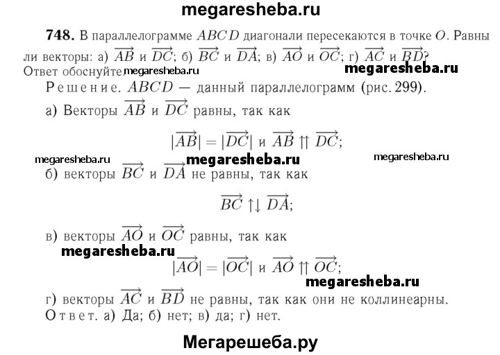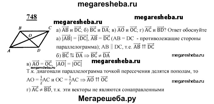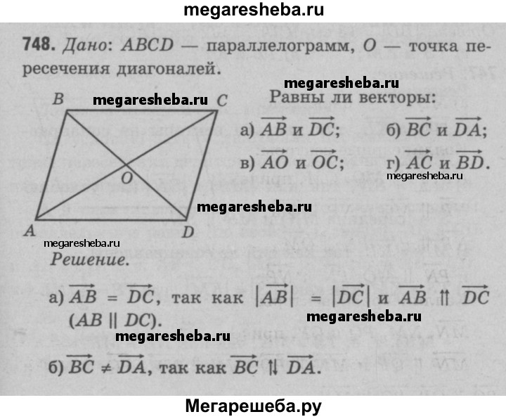 748 Диагонали параллелограмма ABCD пересекаются в точке О. Равны ли векторы: а) АВ и DC; б) ВС и DA; в) АО и ОС; г) АС и BD? Ответ обоснуйте.