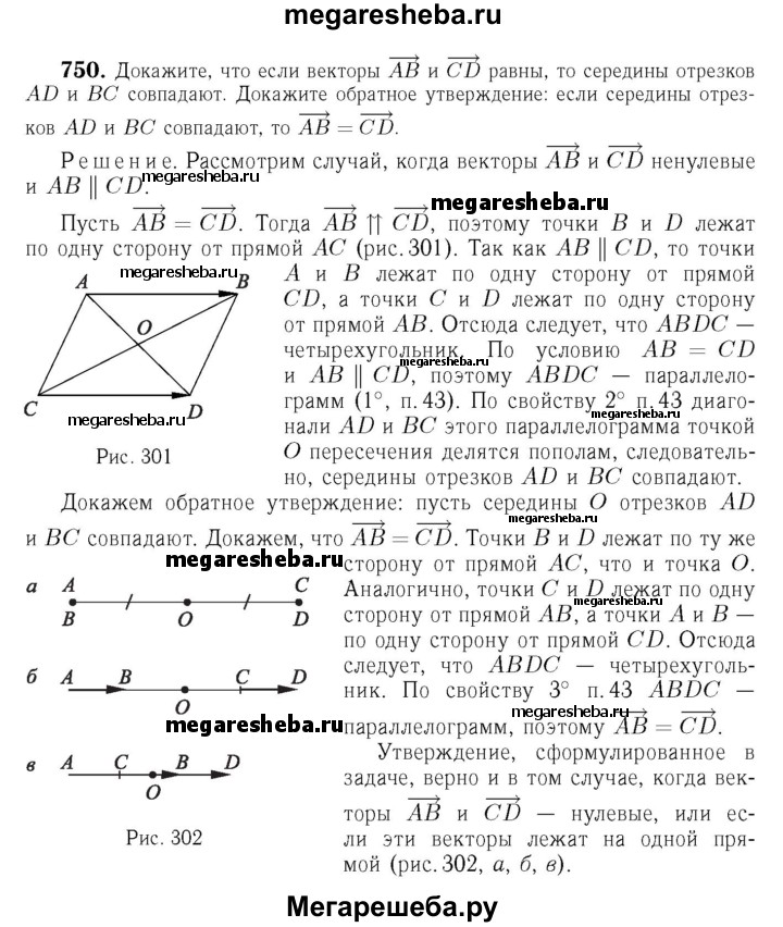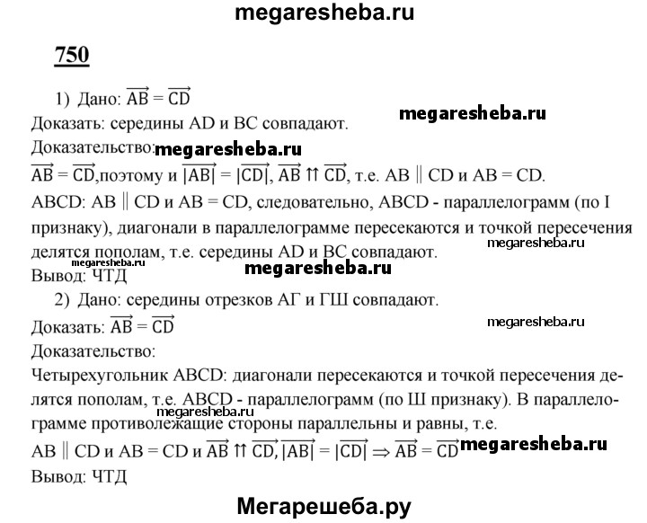 750 Докажите, что если векторы АВ и CD равны, то середины отрезков AD и ВС совпадают. Докажите обратное утверждение: если середины отрезков AD и ВС совпадают, то AB = CD.