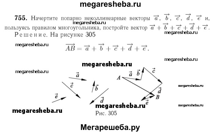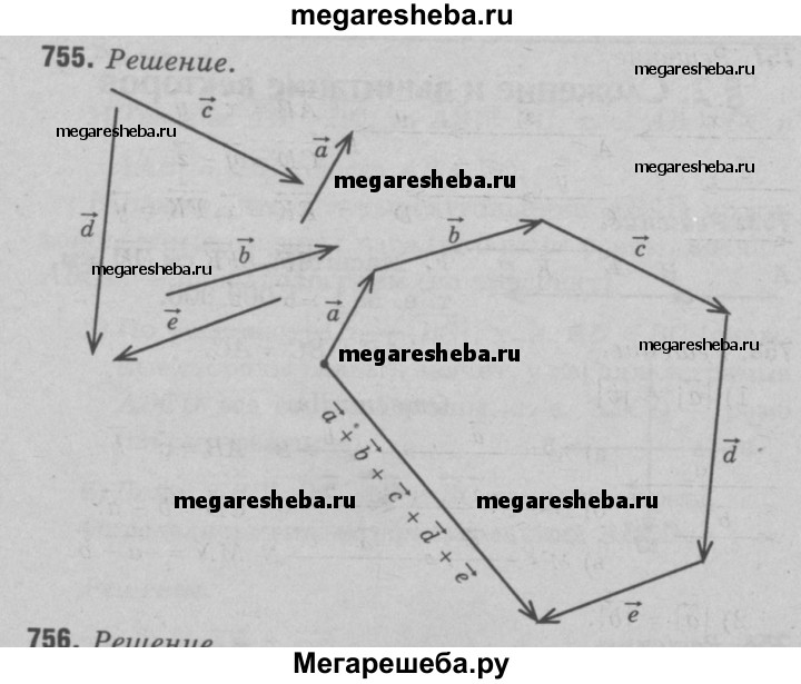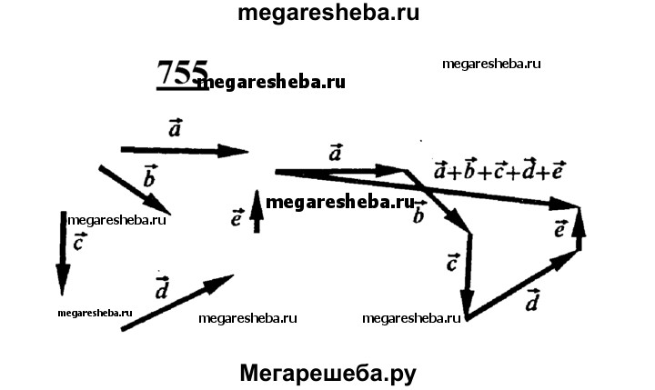755 Начертите попарно неколлинеарные векторы а, Ь, с, d, е и, пользуясь правилом многоугольника, постройте вектор a + b + c + d + e.