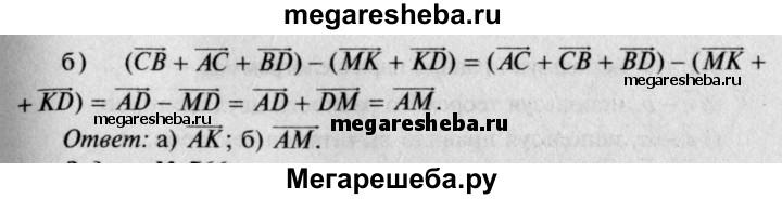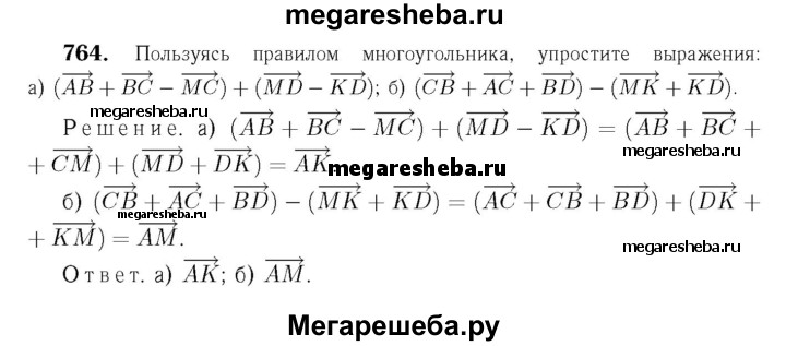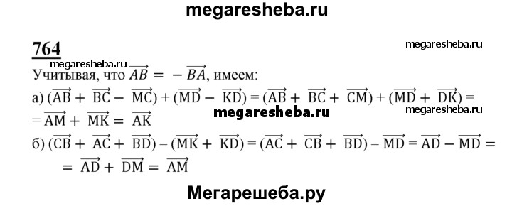764 Пользуясь правилом многоугольника, упростите выражение: а) (АВ + ВС - МС) + (MD - KD); б) (СВ +AC + BD)-(MK + KD).