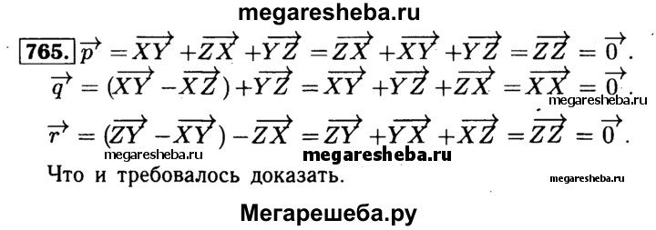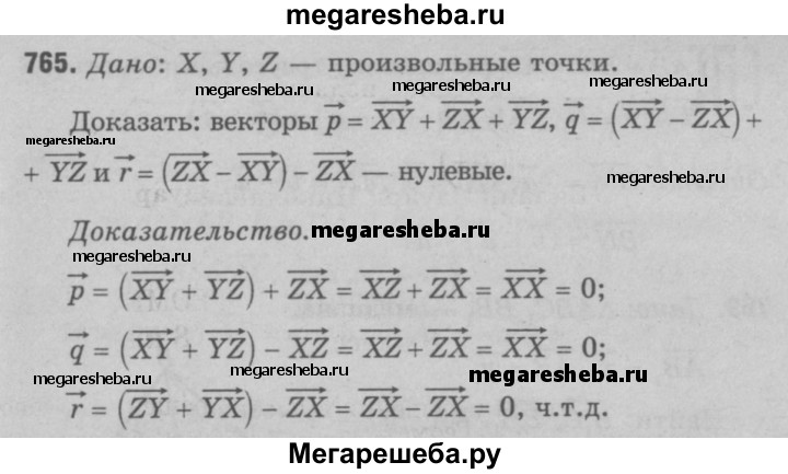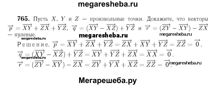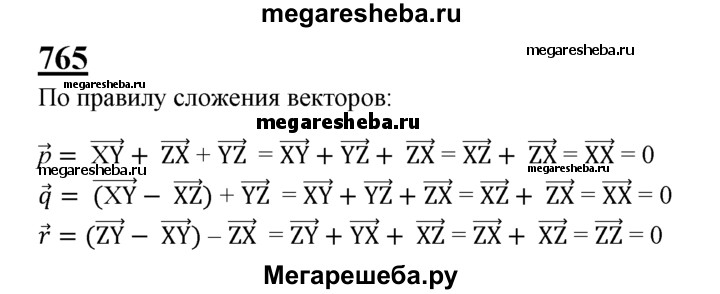765 Пусть X, Y и Z — произвольные точки. Докажите, что векторы р = XY + ZX + YZ, q = (XY-XZ) + YZ и r = (ZY-XY)-ZX нулевые.