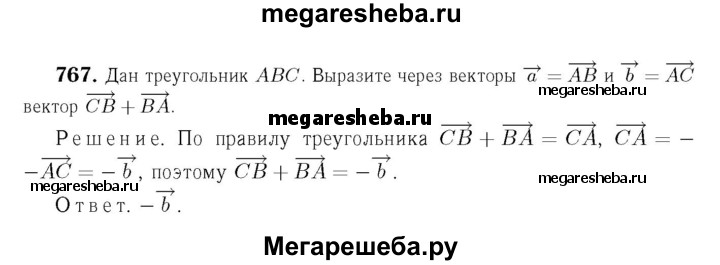 767 Дан треугольник ABC. Выразите через векторы а = АВ и Ь = АС следующие векторы: а) ВА; б) СВ; в) СВ + ВА.