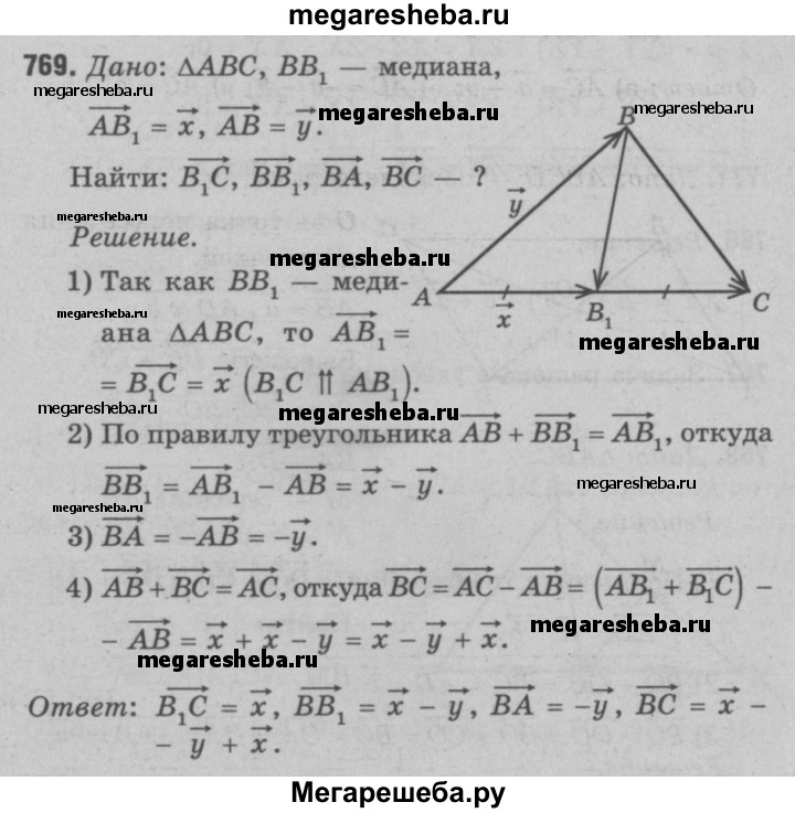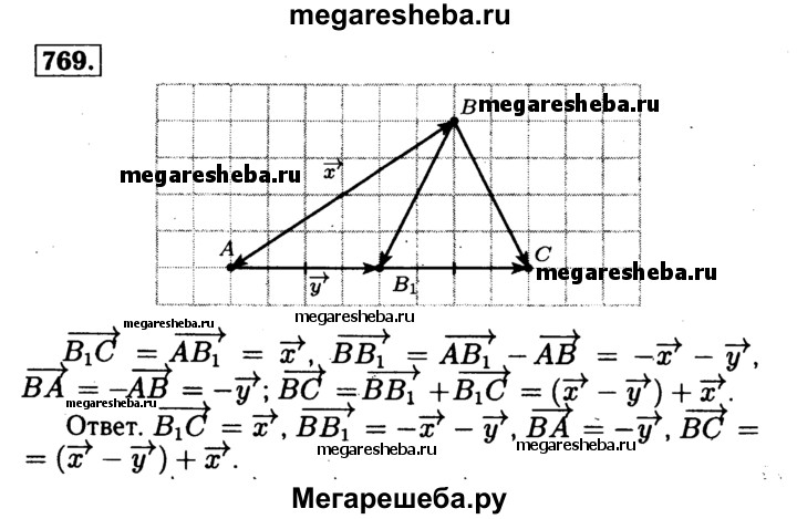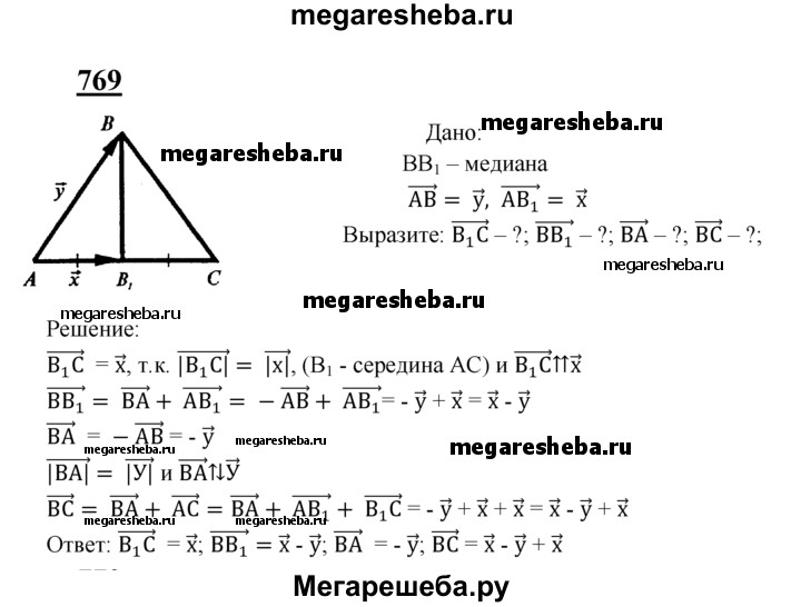 769 Отрезок ВВХ — медиана треугольника ABC. Выразите векторы B1C, BB1, ВА, ВС через х = АВ1 и у = АВ.