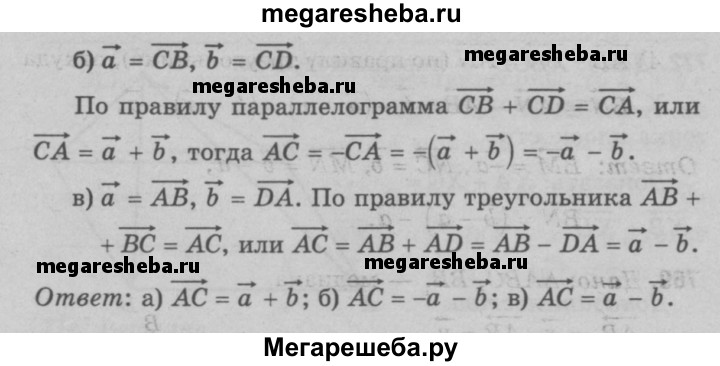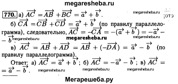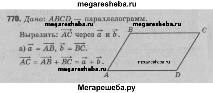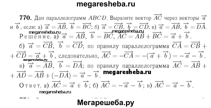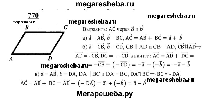 770 Дан параллелограмм ABCD. Выразите вектор АС через векторы а и b, если: а) а = АВ, b = ВС; б) а = СВ, b = CD; в) а = АВ, b = DA.