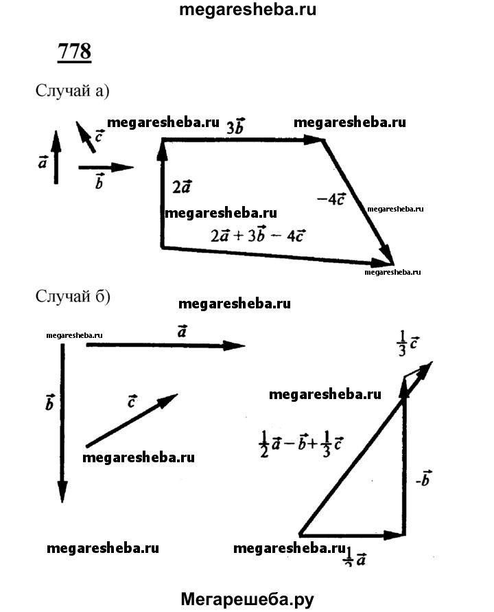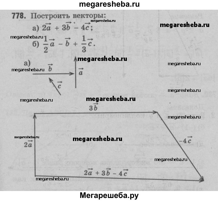 778 Начертите попарно неколлинеарные векторы а, b и с. Постройте векторы: а) 2а + 36-4с; б) ½ а - b + 1/3с.