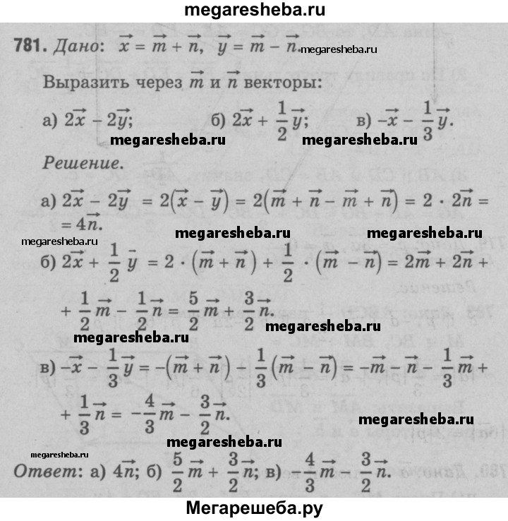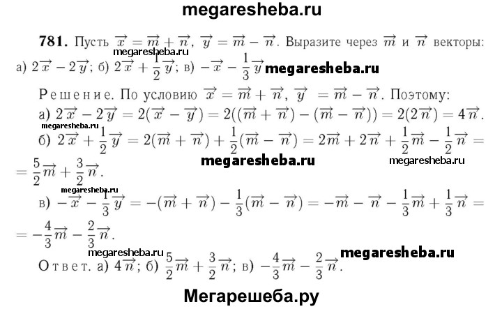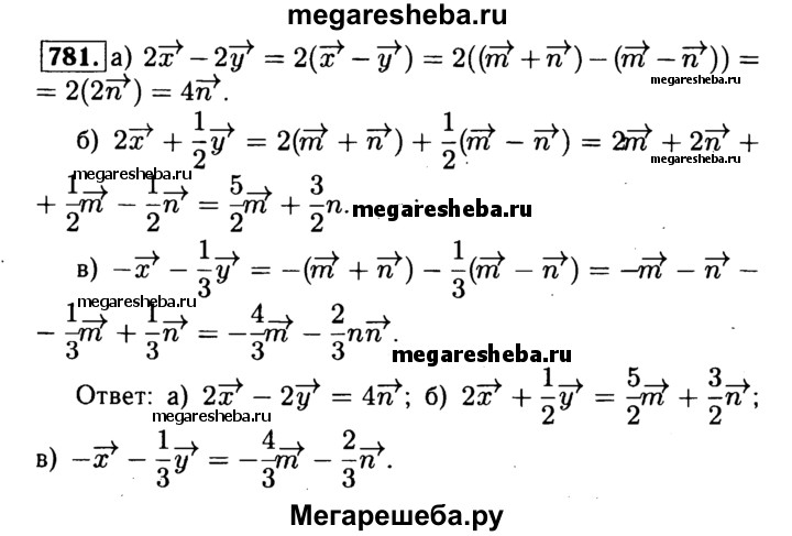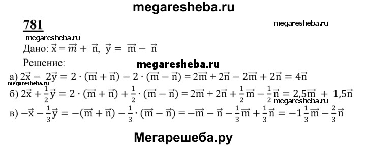 781 Пусть х - m + n, у = m - n. Выразите через тип векторы: а) 2x;-2у; 6)2х + ½ у; в)-х - 1/3у.