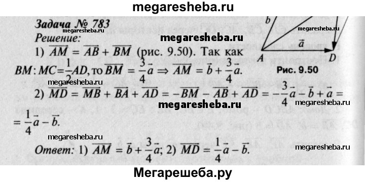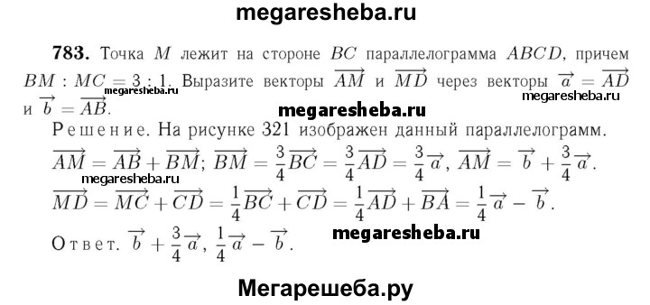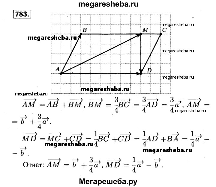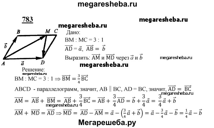 783 Точка М лежит на стороне ВС параллелограмма ABCD, причём ВМ : МС = 3:1. Выразите векторы AM и MD через векторы а = AD и b = АВ.