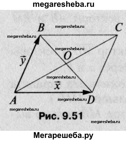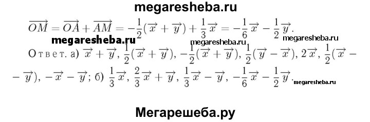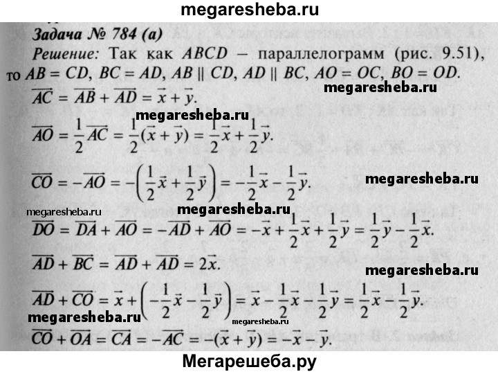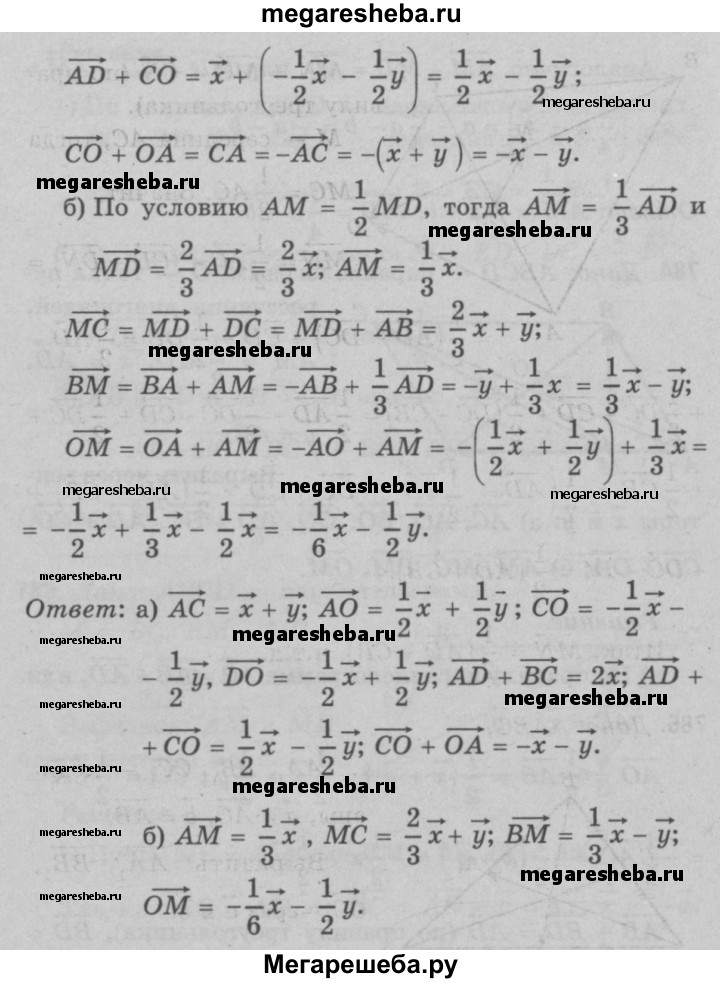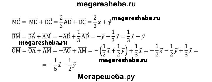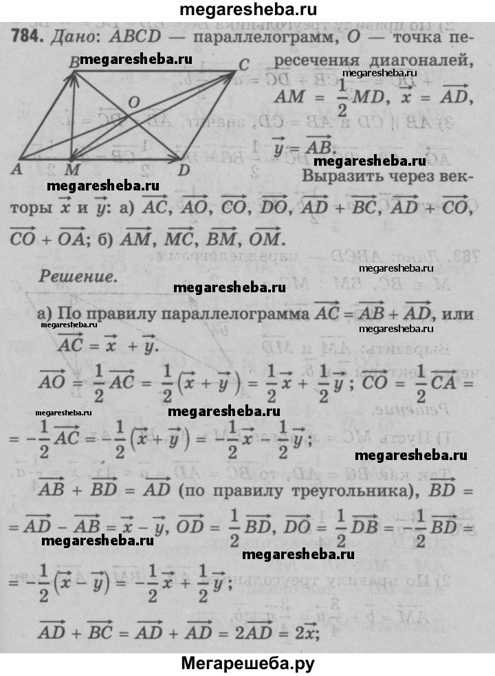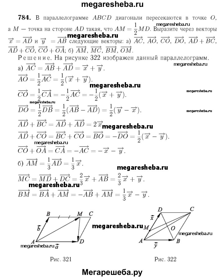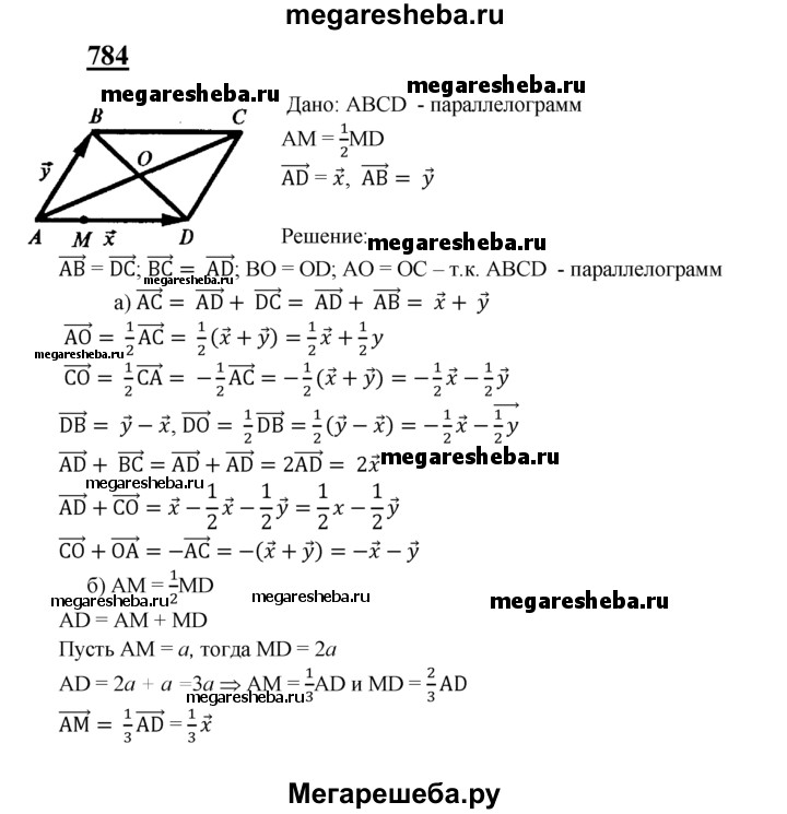 784 О В параллелограмме ABCD диагонали пересекаются в точке О, а М — такая точка на стороне AD, что AM - — MD. Выразите через векторы x = AD, у = АВ следующие векторы: а) AC, АО, CCKDO, AD + BC, AD + CO, СО + ОА; б) AM, МС, ВМ, ОМ.
