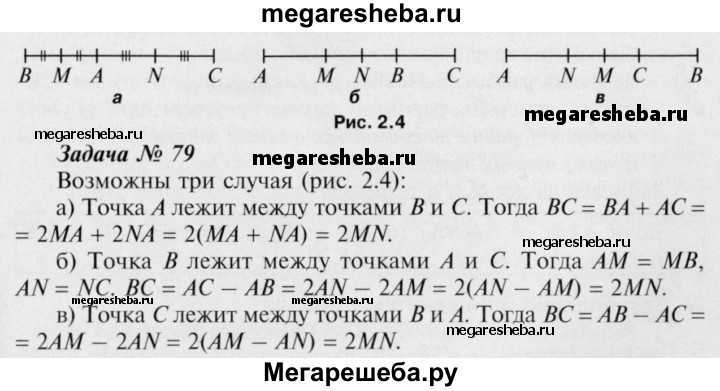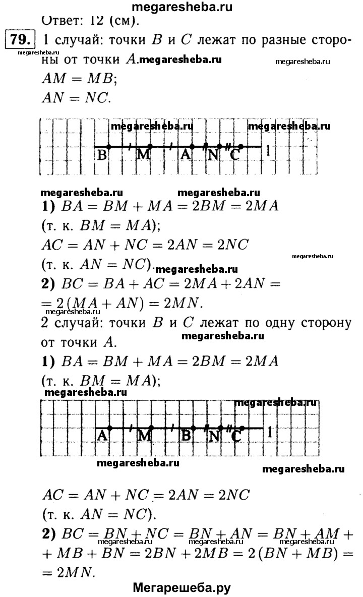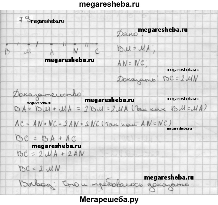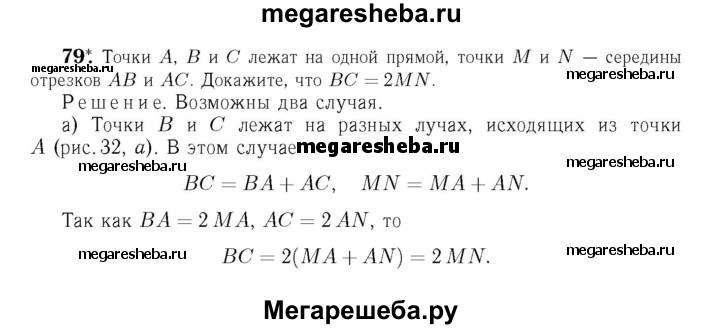 79* Точки А, В и С лежат на одной прямой, точки М и N — середины отрезков АВ и АС. Докажите, что ВС = 2MN.