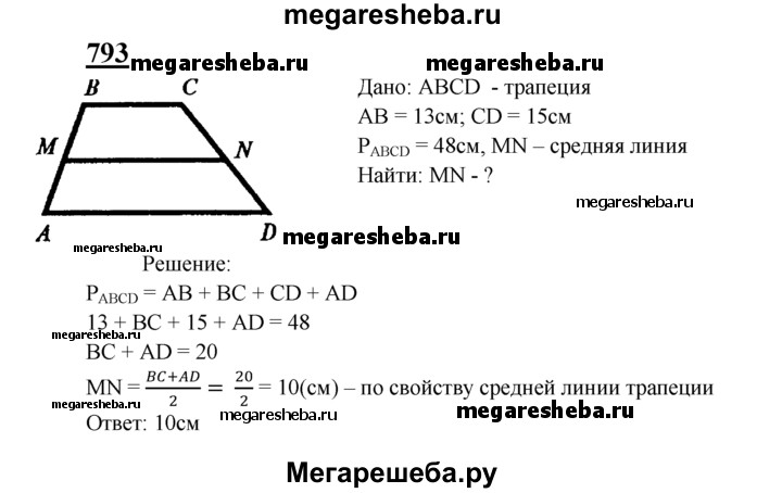 793 Боковые стороны трапеции равны 13 см и 15 см, а периметр равен 48 см. Найдите среднюю линию трапеции.