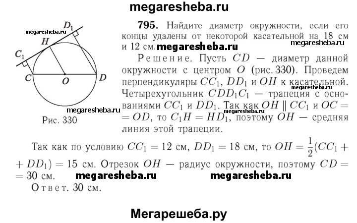 795 Найдите диаметр окружности, если его концы удалены от некоторой касательной на 18 см и 12 см.