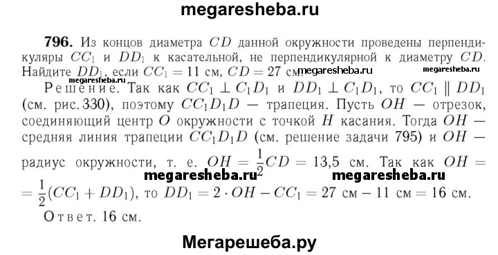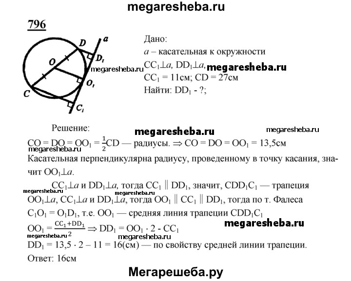796 Из концов диаметра CD данной окружности проведены перпендикуляры СС1 и DD1 к касательной, не перпендикулярной к диаметру CD. Найдите DD1, если СС1 = 11 см, a CD = 27 см.