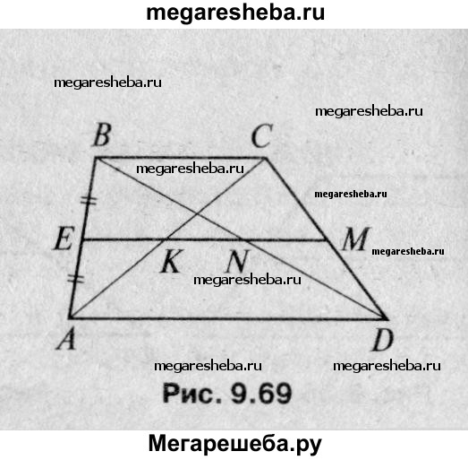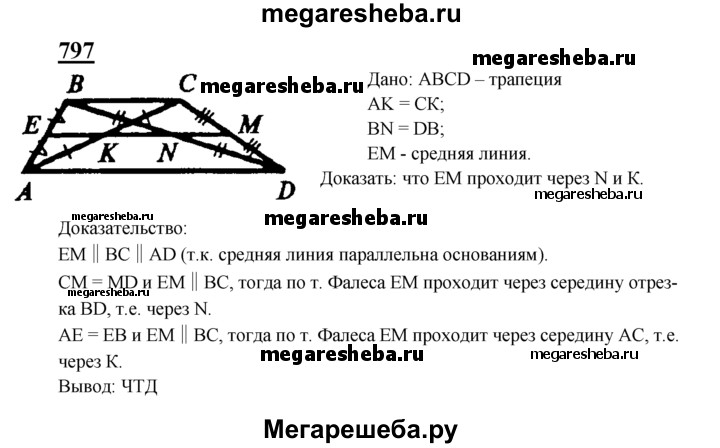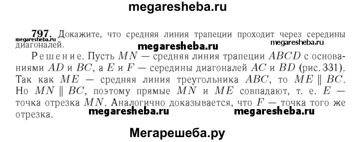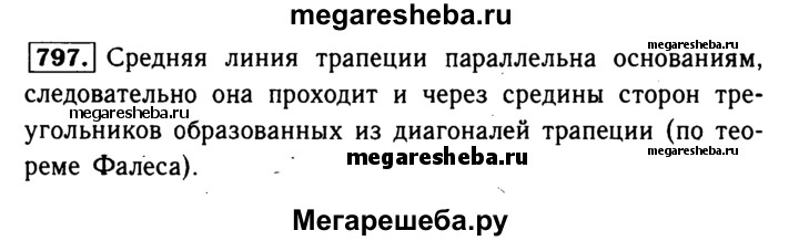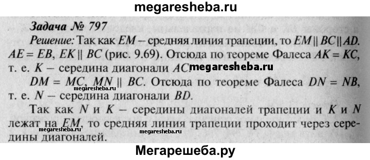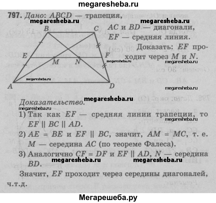 797 Докажите, что средняя линия трапеции проходит через середины диагоналей.