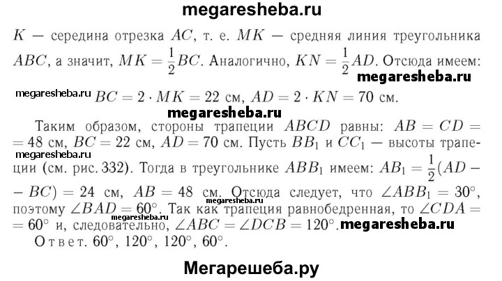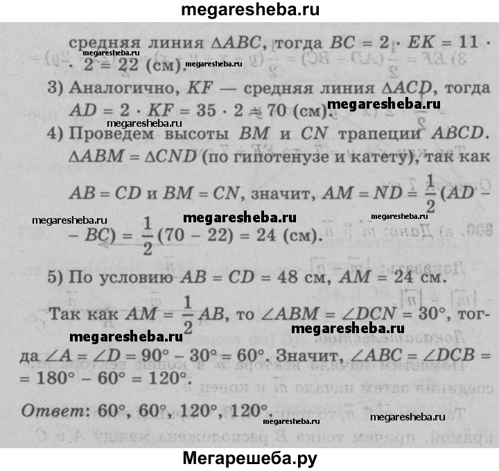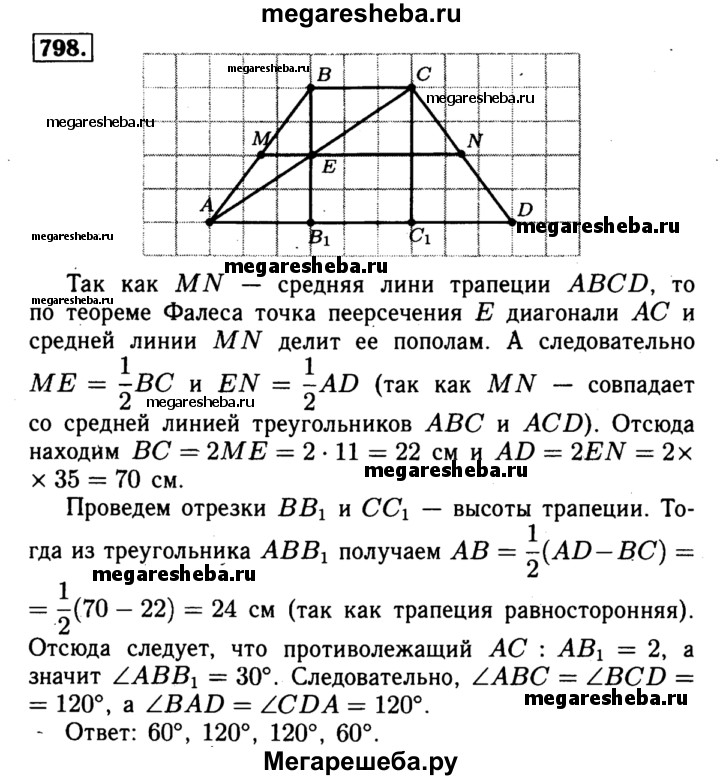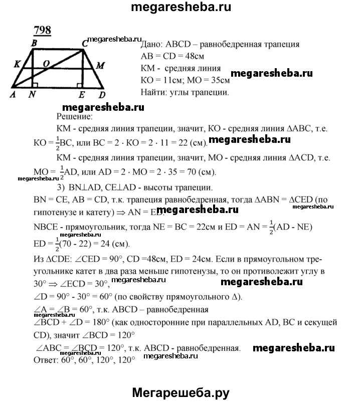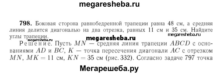 798 Боковая сторона равнобедренной трапеции равна 48 см, а средняя линия делится диагональю на два отрезка, равные 11 см и 35 см. Найдите углы трапеции.