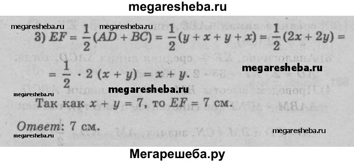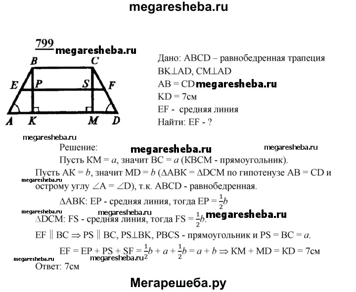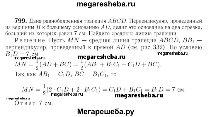 799 Дана равнобедренная трапеция ABCD. Перпендикуляр, проведённый из вершины В к большему основанию AD, делит это основание на два отрезка, больший из которых равен 7 см. Найдите среднюю линию трапеции.