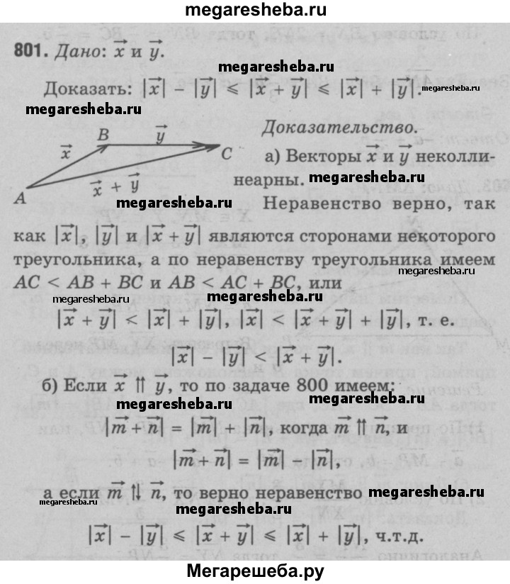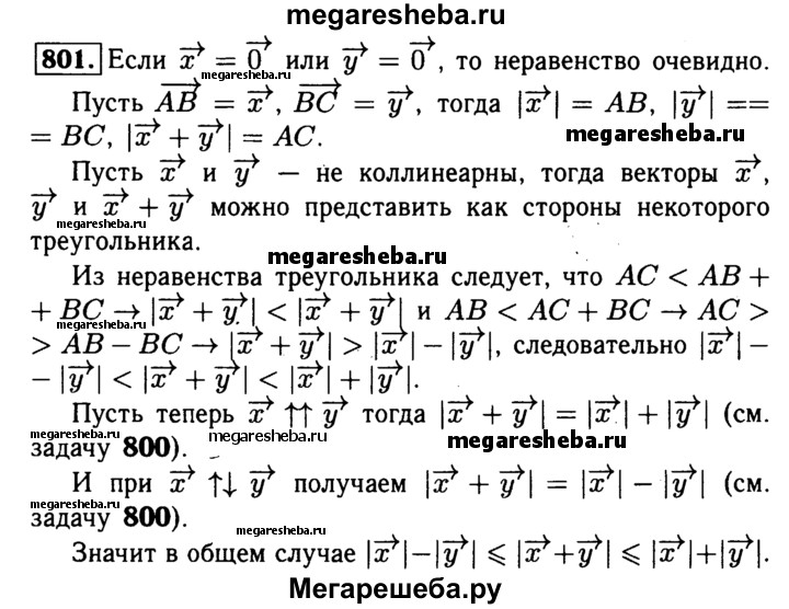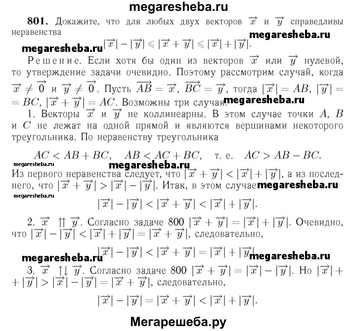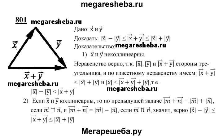 801 Докажите, что для любых векторов х и у справедливы неравенства |x|-|y| ≤ |x + y| ≤ |x| + |y|.