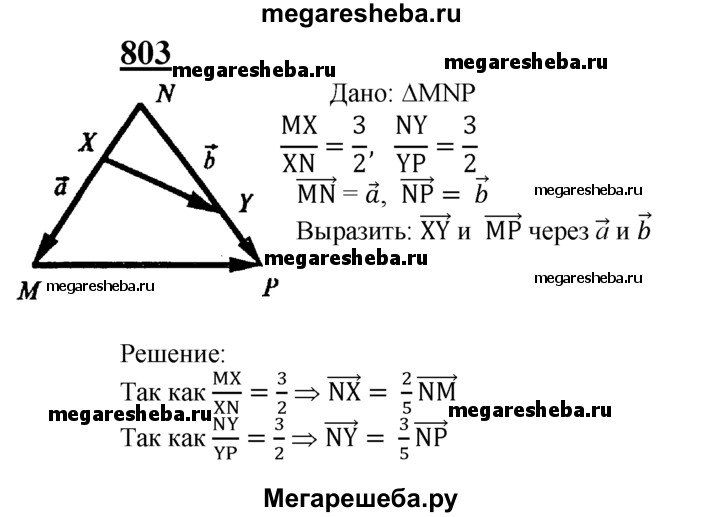 803 На сторонах MN и NP треугольника MNP отмечены соответственно точки X и Y так, что MX/NX = 3/2 и NY/YP = 3/2. Выразите векторы XY и MP через векторы a = NM и b = NP.