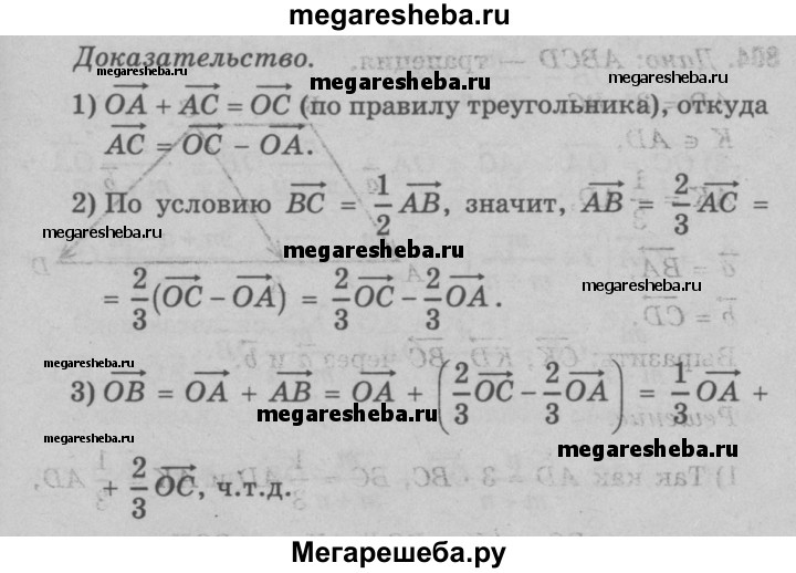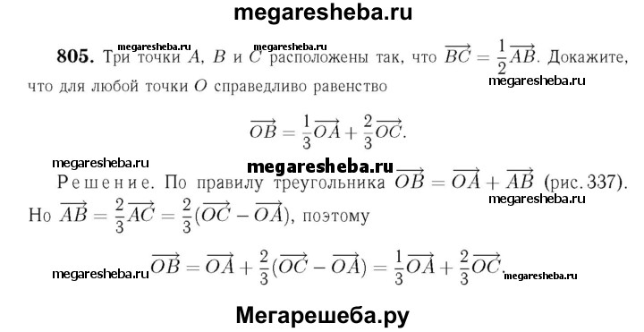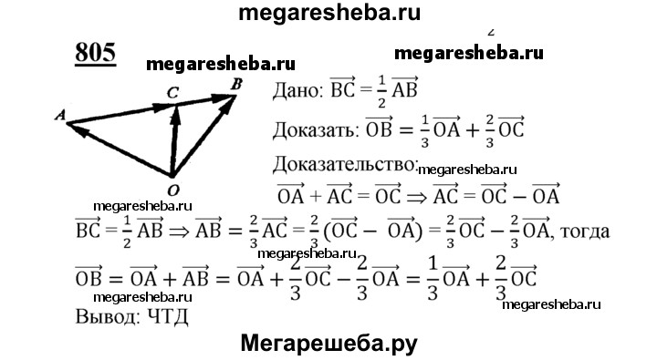 805 Три точки А, В и С расположены так, что ВС = ½ АВ. Докажите, что для любой точки О справедливо равенство ОВ = 1/3 ОА + 2/3 ОС.