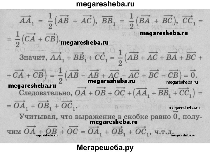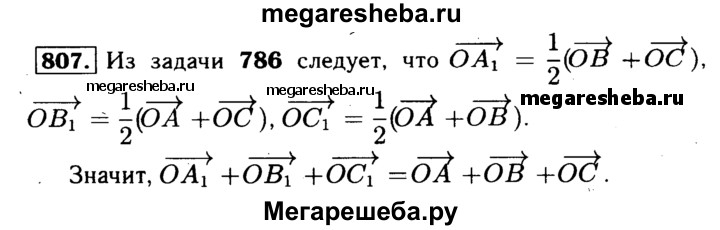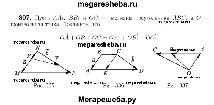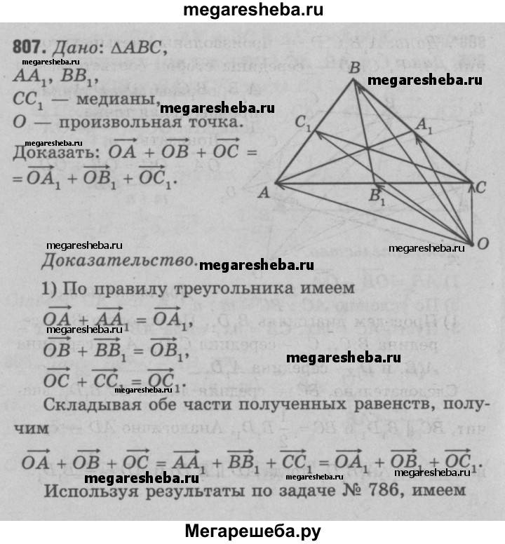 807 Отрезки AA1 ВВ1 и СС1 — медианы треугольника ABC, О — произвольная точка. Докажите, что ОА + ОВ + ОС = ОА1 + OB1 + ОС1.