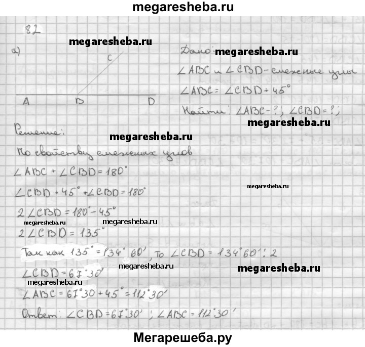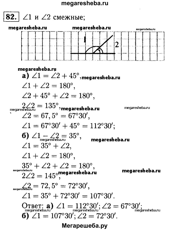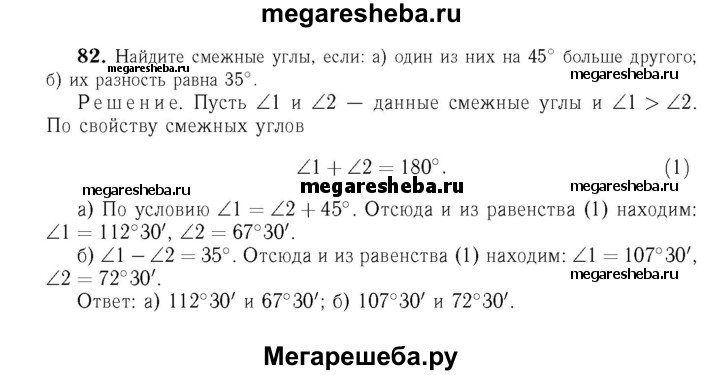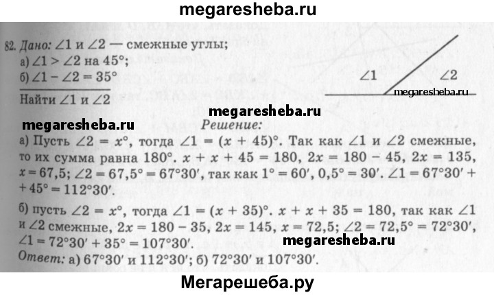 82 Найдите смежные углы, если: а) один из них на 45° больше другого; б) их разность равна 35°.