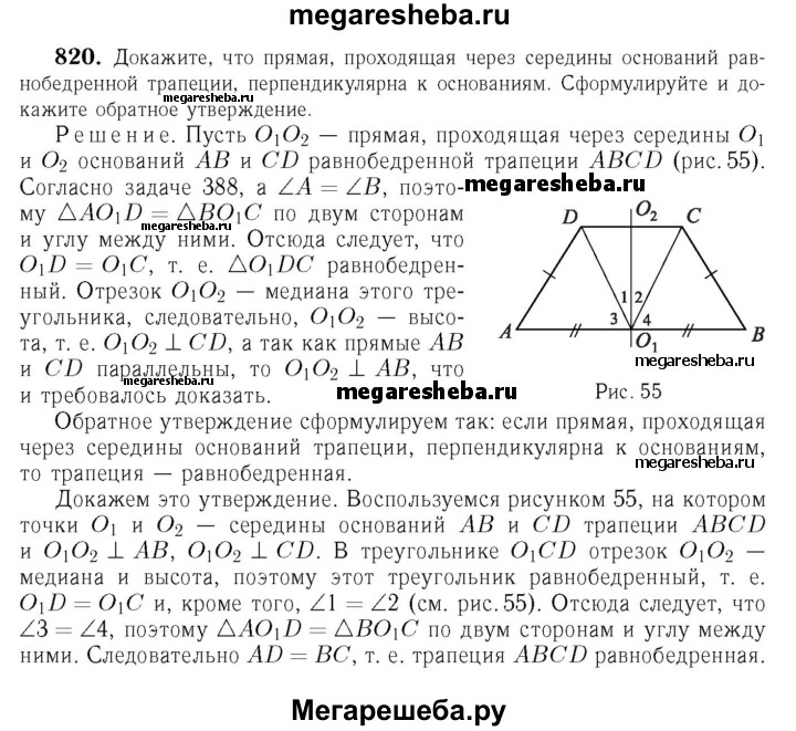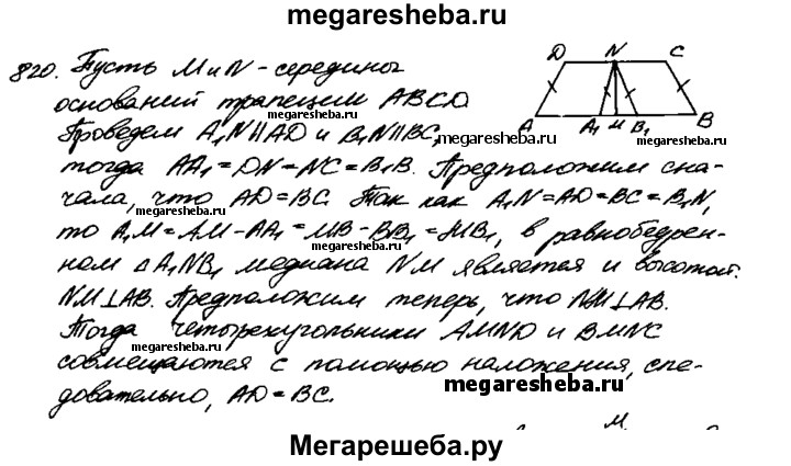 820 Докажите, что прямая, проходящая через середины оснований равнобедренной трапеции, перпендикулярна к основаниям. Сформулируйте и докажите обратное утверждение.