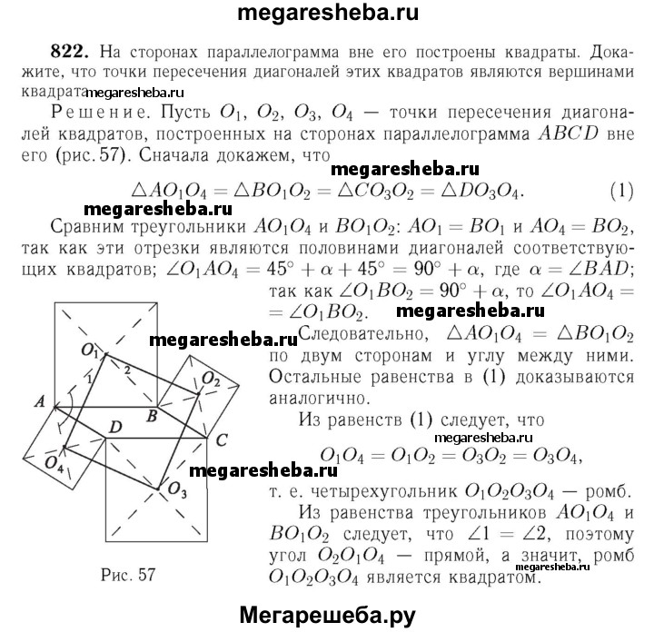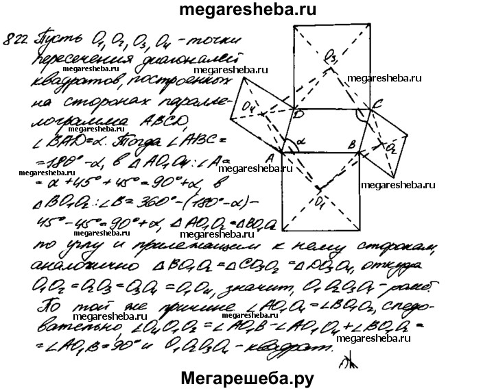 822 На сторонах параллелограмма вне его построены квадраты. Докажите, что точки пересечения диагоналей этих квадратов являются вершинами квадрата.