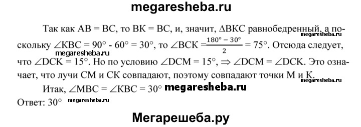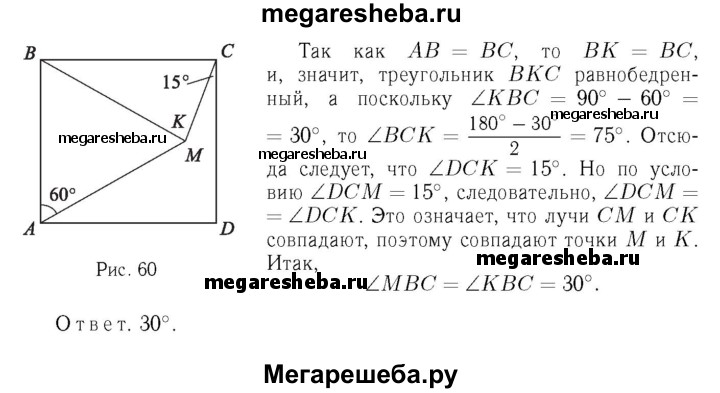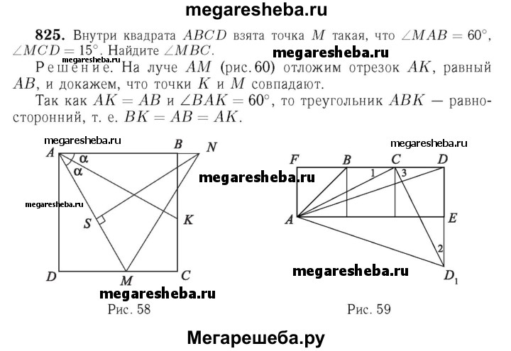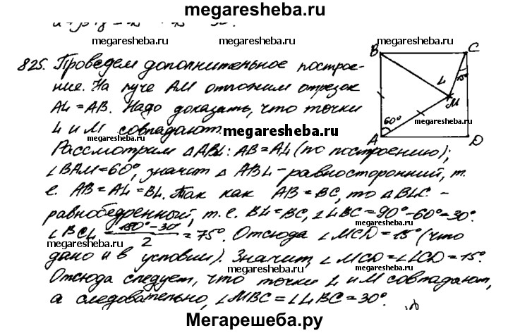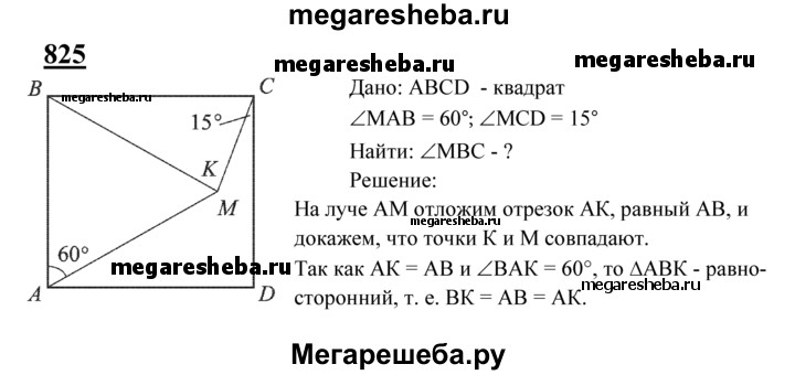 825 Внутри квадрата ABCD взята такая точка М, что ∠MAB = 60°, ∠MCD = 15°. Найдите ∠MBC.