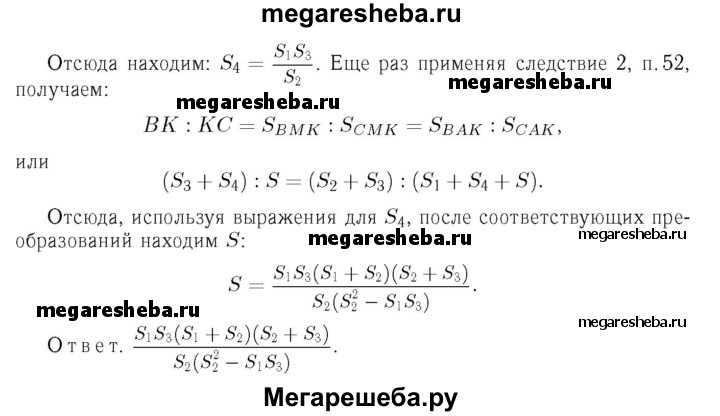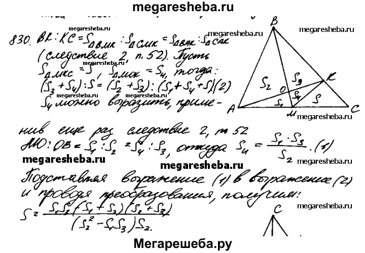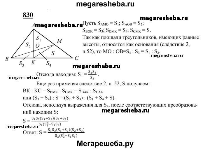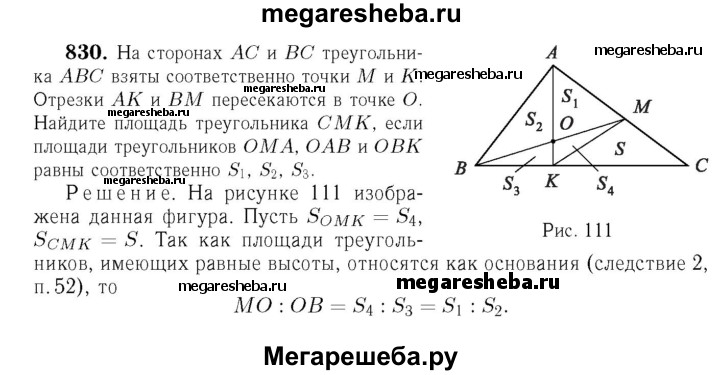 830 На сторонах АС и ВС треугольника ABC взяты соответственно точки М и К. Отрезки АК и ВМ пересекаются в точке О. Найдите площадь треугольника СМК, если площади треугольников ОМА, ОАВ и ОВК равны соответственно Sl S2, S3.