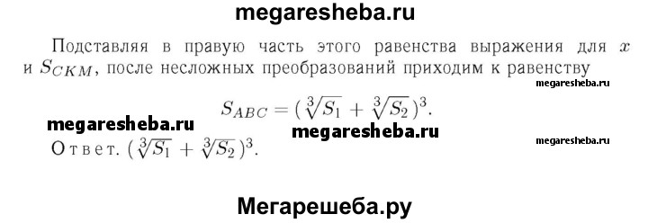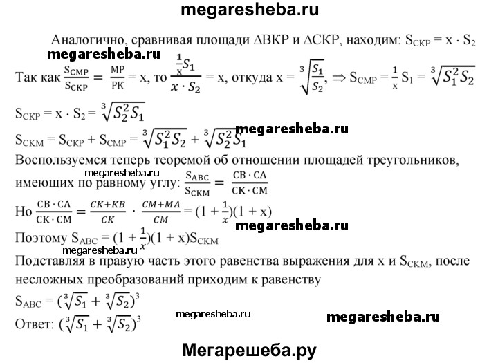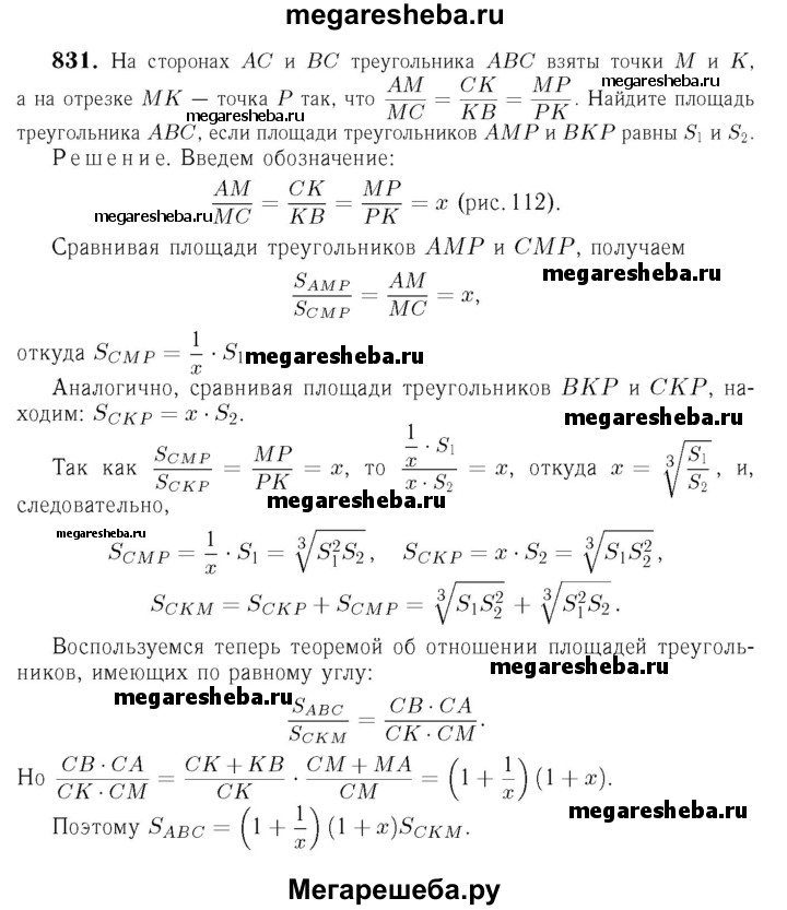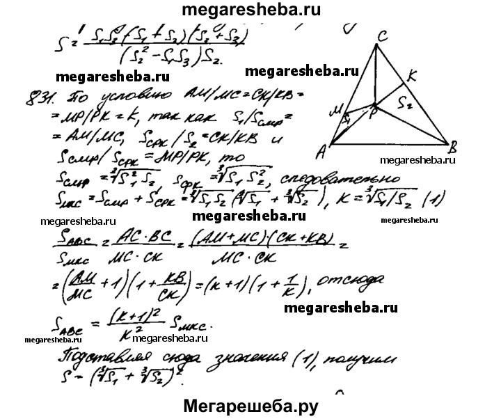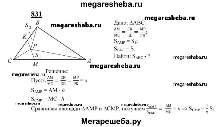831 На сторонах АС и ВС треугольника ABC взяты точки М и К, а на отрезке МК — точка Р так, что AM/MC = CK/KB = MP/PK. Найдите площадь треугольника ABC, если площади треугольников AMP и ВКР равны S1 и S2.
