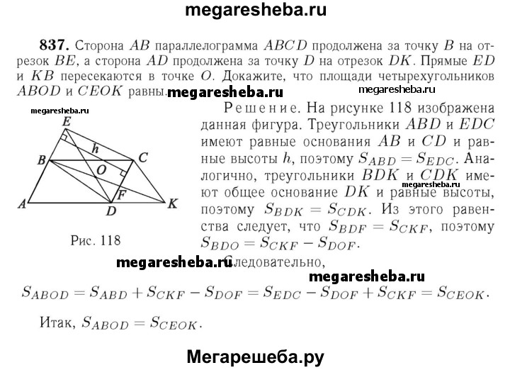 837 Сторона АВ параллелограмма ABCD продолжена за точку В на отрезок BE, а сторона AD продолжена за точку D на отрезок DK. Прямые ED и KB пересекаются в точке О. Докажите, что площади четырёхугольников ABOD и СЕОК равны.
