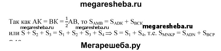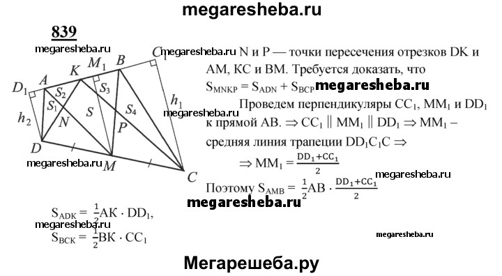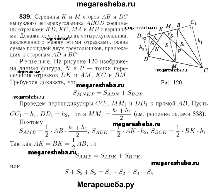 839 Середины К и М сторон АВ и DC выпуклого четырёхугольника ABCD соединены отрезками KD, КС, МА и MB соответственно с его вершинами. Докажите, что площадь четырёхугольника, заключённого между этими отрезками, равна сумме площадей двух треугольников, прилежащих к сторонам AD и ВС.